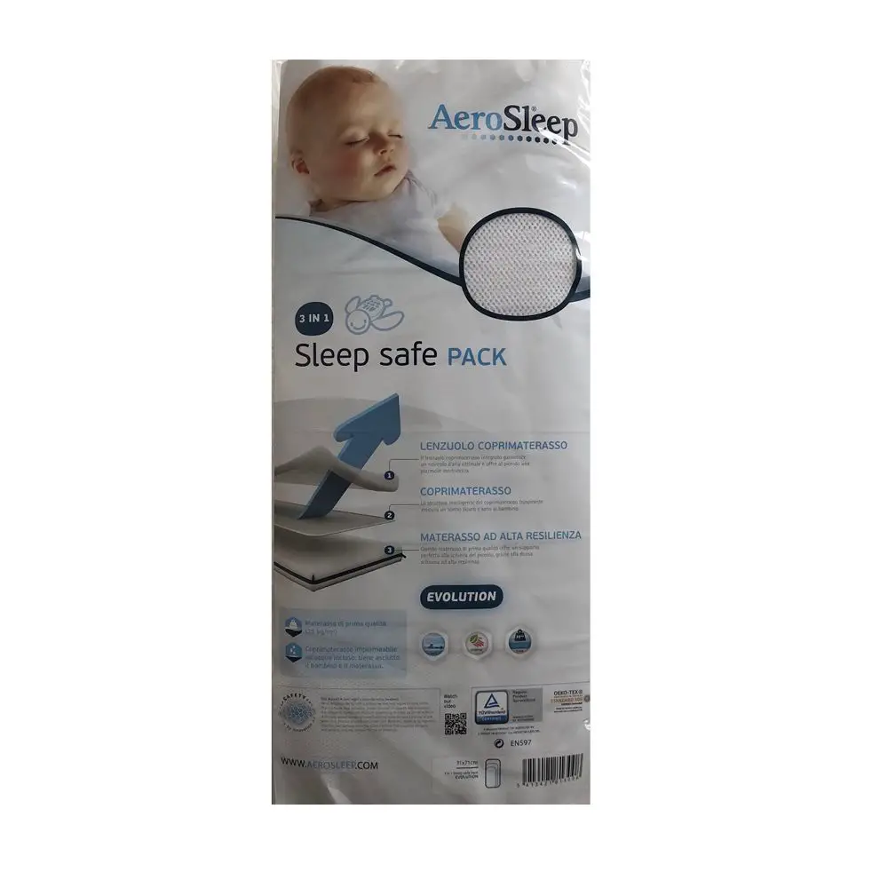 Il Pack Traspirante Aerosleep comprende un materassino ed un coprimaterasso per carrozzina ed è un sistema completo: antisoffoco, antiacaro, sicuro ed igienico. Il materassino è imbottito in poliuretano espanso a rigidità progressiva che garantisce un supporto ottimale e confortevole al bimbo, assicurandogli un riposo corretto e è rivestito in cotone 100% trattato antiacaro e certificato Oeko-Tex. Il coprimaterasso, pratico da applicare grazie alle fasce elastiche, è composto da 3 strati: strato d’aria: la speciale struttura alveolare a 3D garantisce una ventilazione ottimale strato assorbente: trattiene l’umidità lasciando il bambino asciutto strato idrorepellente: protegge il materasso dall’umidità Grazie alla sua speciale composizione, protegge efficacemente il materasso da acari, umidità, polvere, sporcizia e si lava in lavatrice a 60°C. A ogni lavaggio, batteri e allergeni vengono neutralizzati e il bimbo dorme su una superficie sempre fresca e pulita. Il rivestimento del materasso incorporta sia il coprimaterasso antisoffoco che il lenzuolo per offrire una piacevole morbidezza al bambino. Compatibile con la maggior parte delle navicelle.