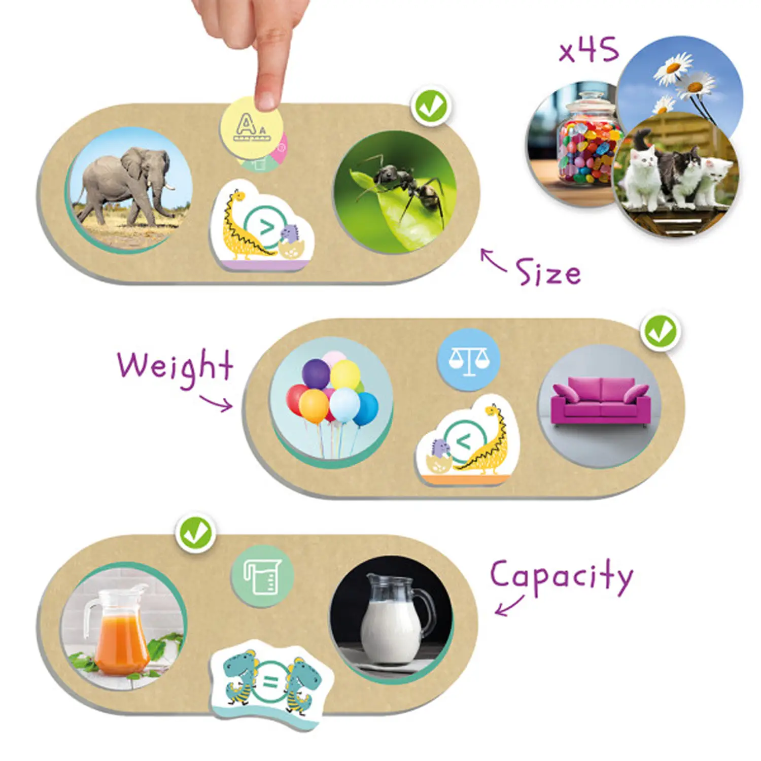 Con questo gioco, i bambini imparano divertendosi a confrontare e comprendere le relazioni matematiche di base, migliorando al contempo importanti abilità cognitive.