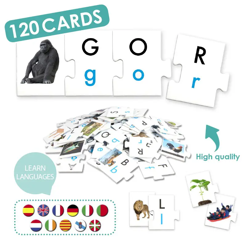 - Tactile and Visual Elements: 32 photo realistic tiles combined with 88 alphabet tiles to build and associate words.