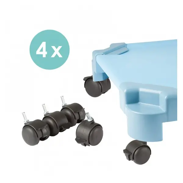 Il Set 4 Ruote Porta-Lettini Perfecta è la soluzione ideale per rendere sicuro, pratico e veloce lo spostamento dei lettini nella scuola dell’infanzia e in altri ambienti educativi.
