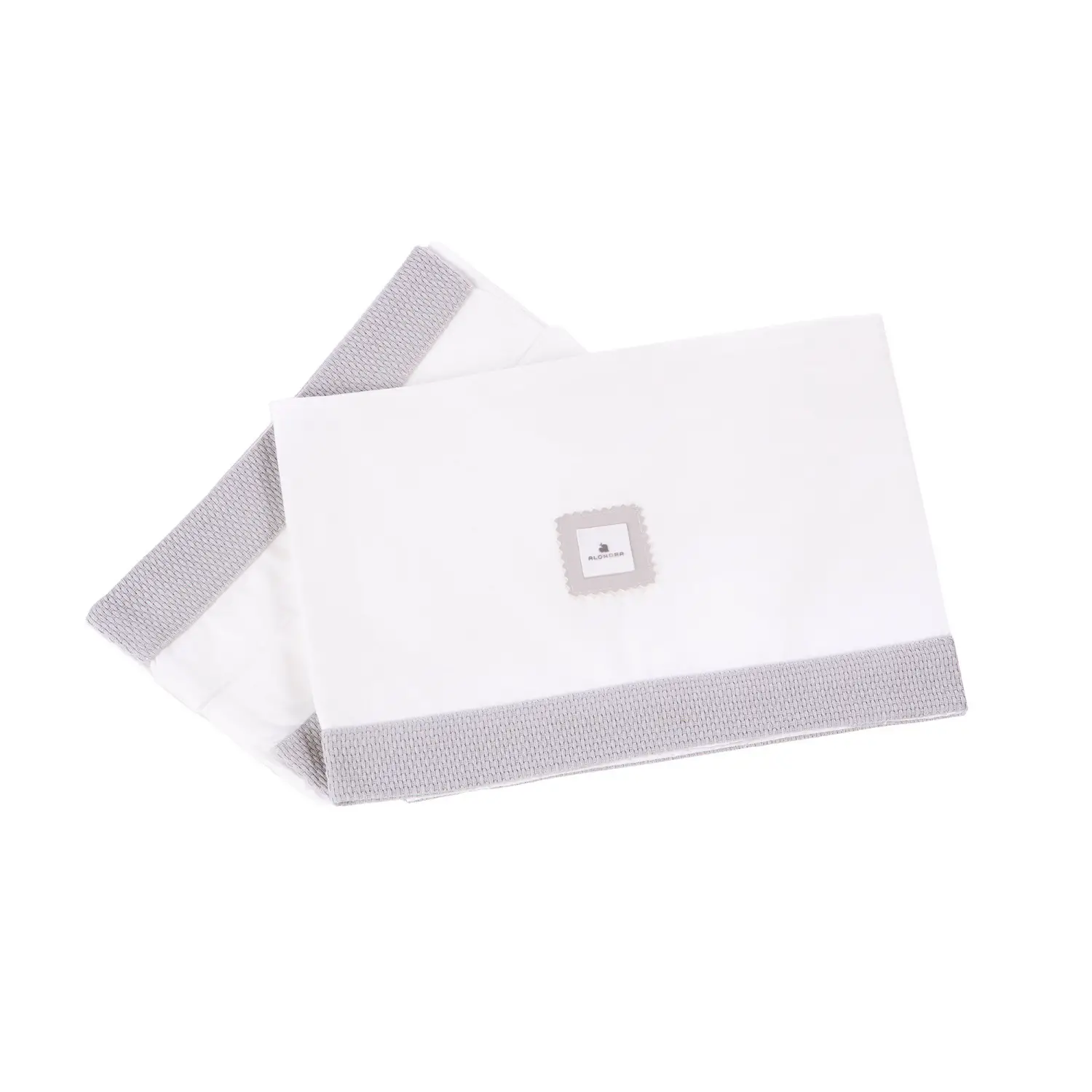 Completo Lenzuola 3 pezzi per Culla Carezza, nei colori grigio e bianco.