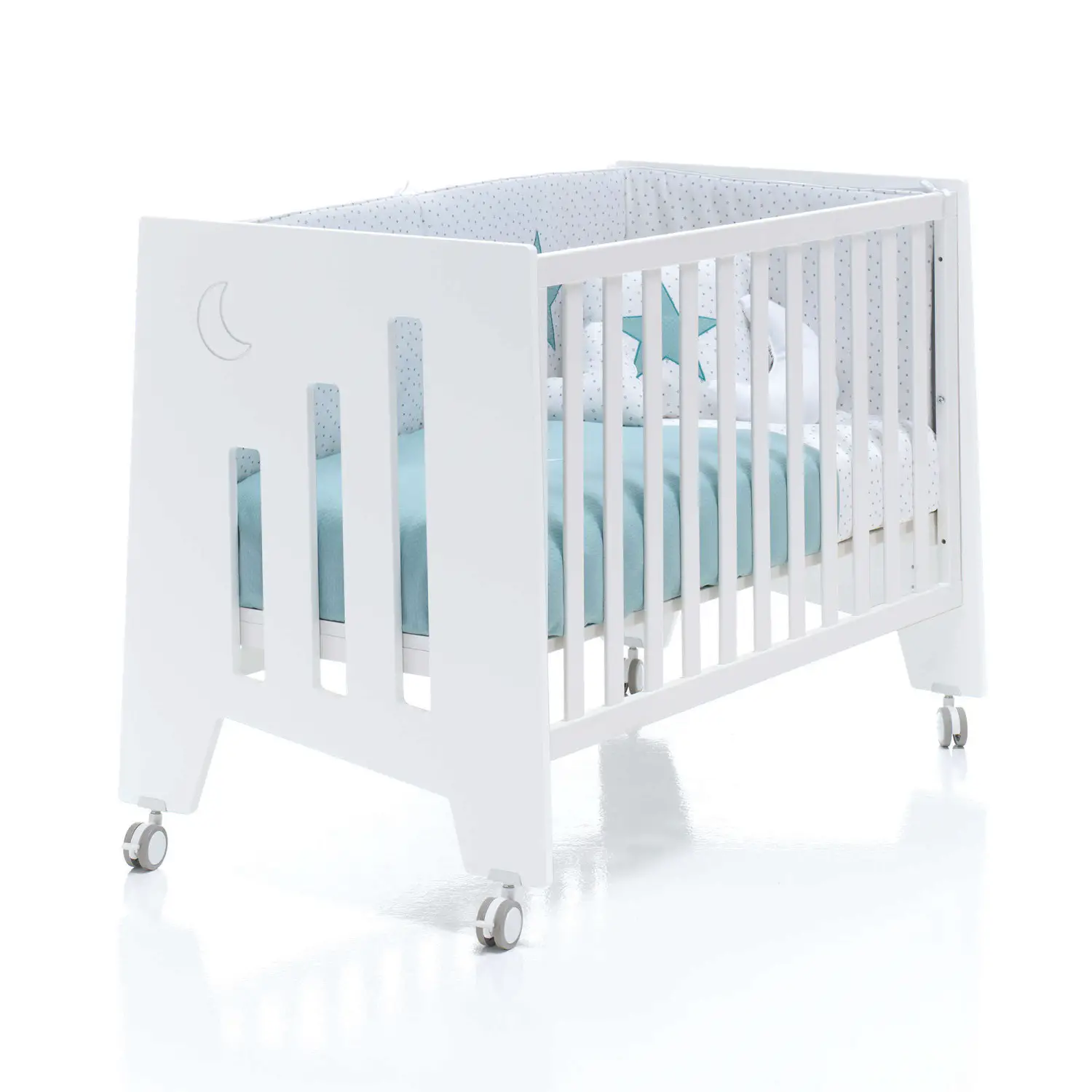 To turn it into a side bed then, simply pull out the side rail and join it to the big bed with the special anchoring straps, the net extension and the additional mattress. Thanks to the possibility of adjusting the net to as many as 5 heights, it will not be difficult to find the right one to join the crib at exactly the same level as mom and dad's crib. The crib is equipped with 4 wheels for conveniently moving it between different rooms in the house.