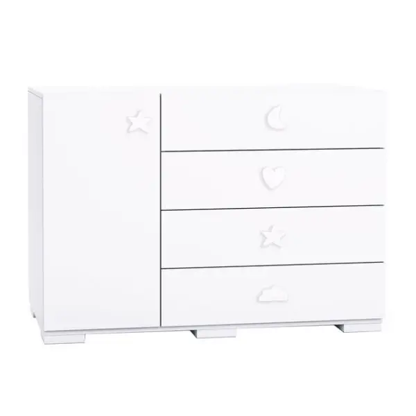 Cassetti: pannello truciolare melaminico. Guide metalliche. Cassetti frontali: MDF laccato (18 mm). Ripiano: vassoio in particelle di melamina (18 mm). Angoli applicati con PVC da 0,4 mm. Maniglie delle porte: MDF (12 mm) laccato. Anta: MDF (18 mm) laccato.