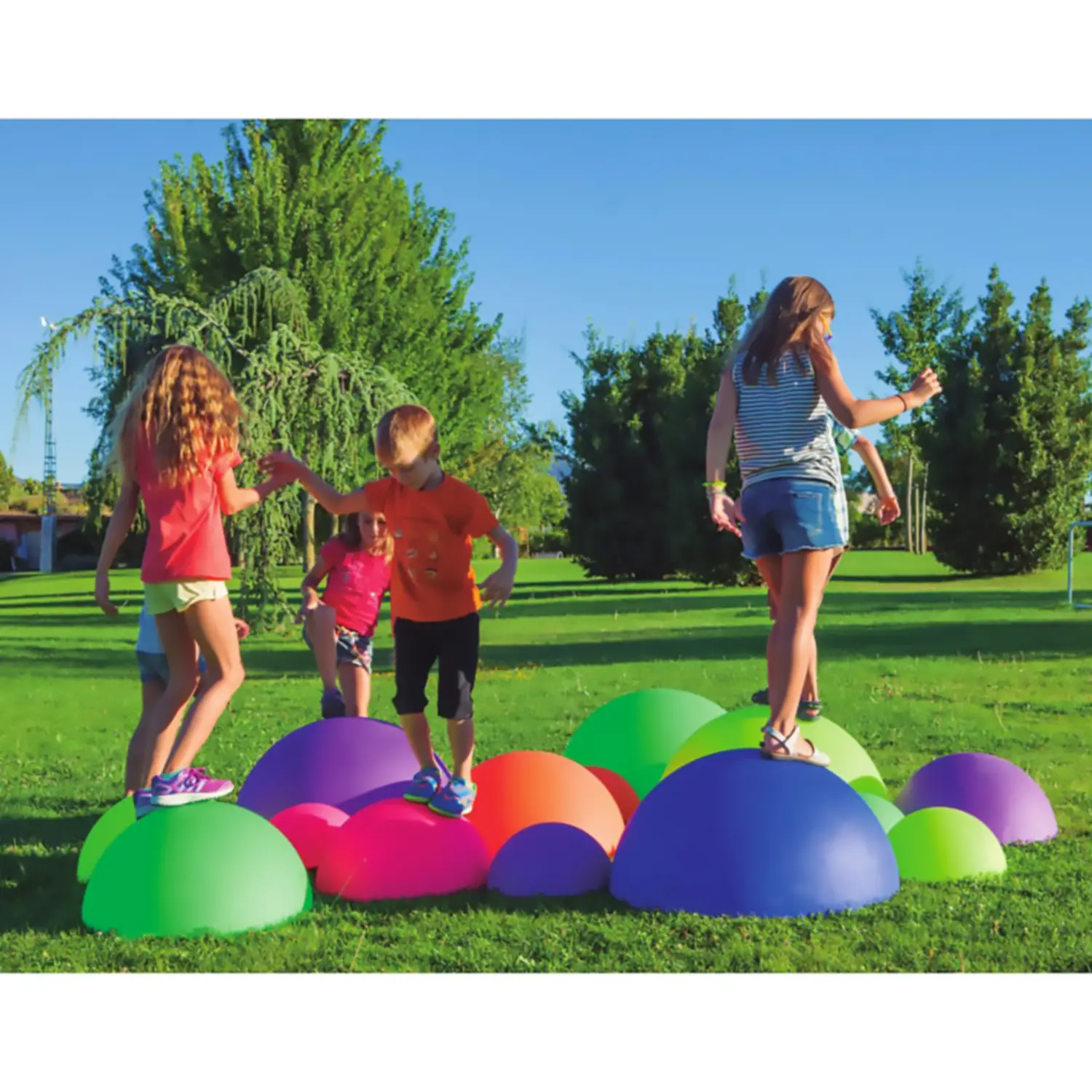 Grandi semisfere per bambini. Sono perfettei come complemento all’attrezzatura del parco giochi della scuola materna o della scuola primaria. Grazie ai loro colori e alle loro forme, incoraggiano i bambini a essere attivi all’aria aperta. Il set comprende 4 emisfere di diverse dimensioni, la base di ogni emisfero equivalente è stata ricoperta da uno strato antiscivolo. Il prodotto permette di sviluppare abilità come la coordinazione motoria, l’equilibrio corporeo e il senso dell’equilibrio. Offre un’interessante varietà di attività sportive durante le quali è possibile utilizzare gli emisferi per organizzare vari tipi di gare