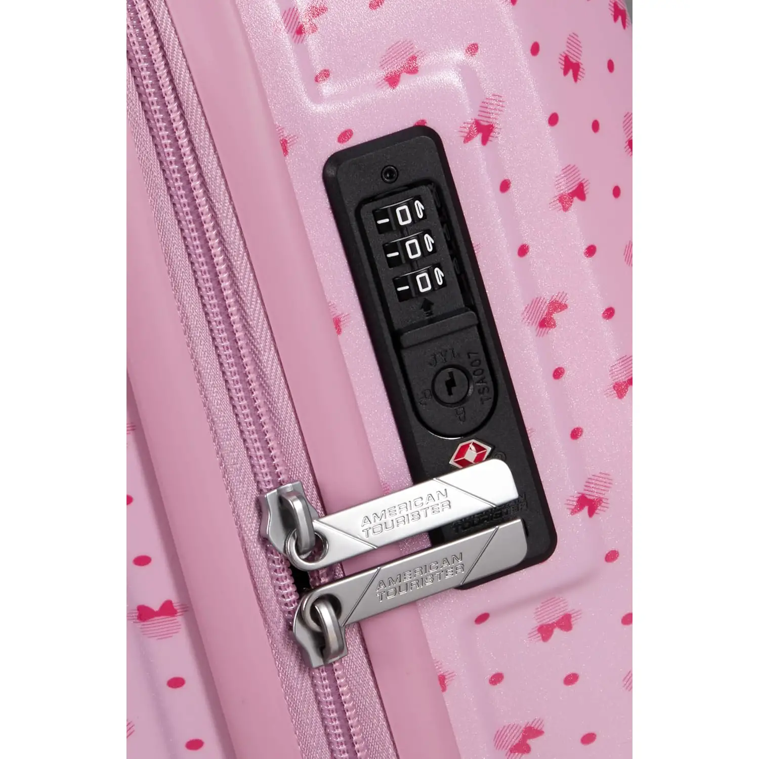 Materiali Resistenti e Dettagli di Stile Texture opaca antigraffio, logo American Tourister con placca argento e design Disney esclusivo per un look giocoso ma resistente all’usura quotidiana.