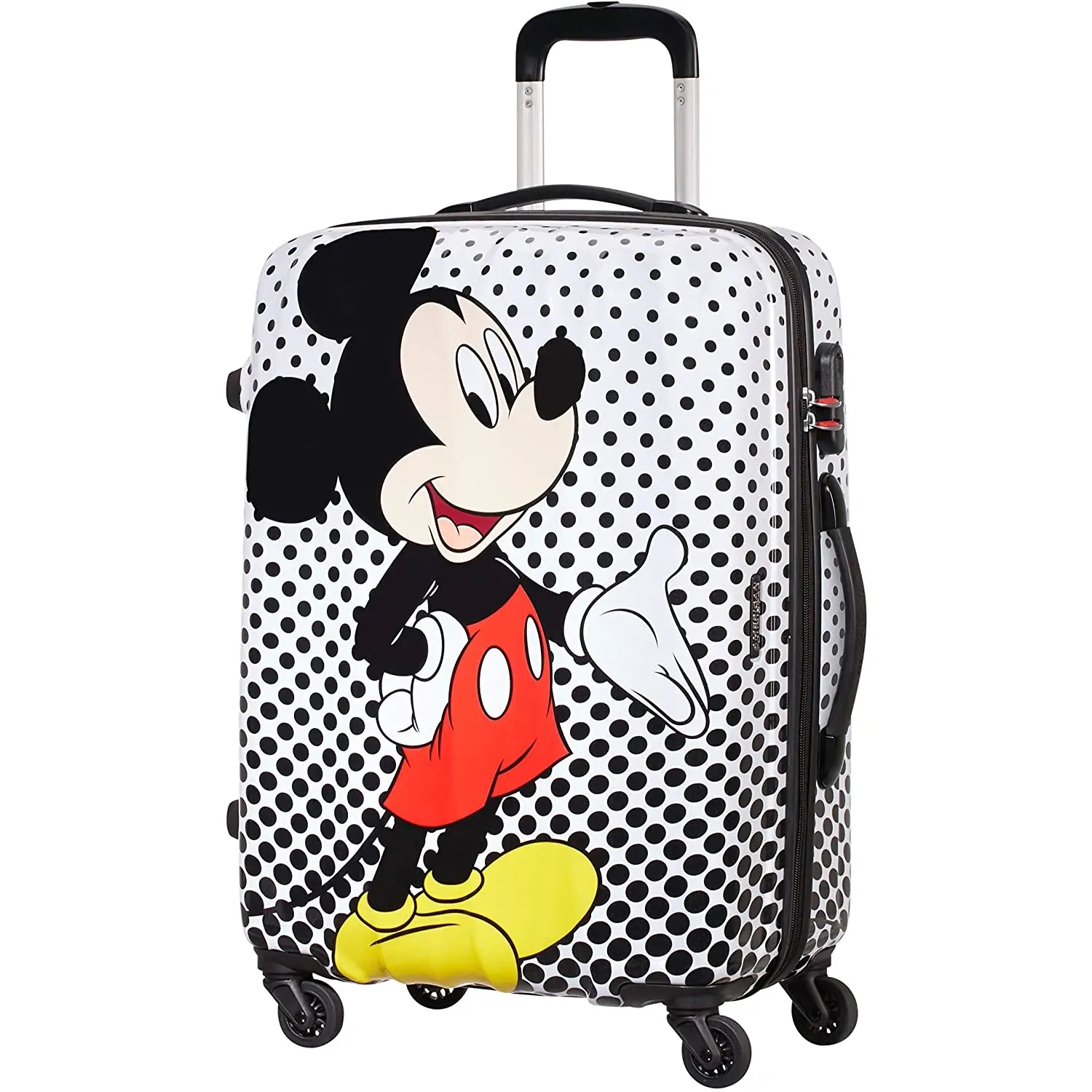 La valigia è dotata di una chiusura fissa con combinazione a 3 cifre per garantire la sicurezza dei contenuti. La stampa sulla valigia è decorata con un divertente motivo Disney, come ad esempio Mickey Mouse Polka Dot, che aggiunge un tocco di allegria e colore al viaggio. La finitura lucida e la fodera coordinata contribuiscono a creare un aspetto accattivante e coordinato.