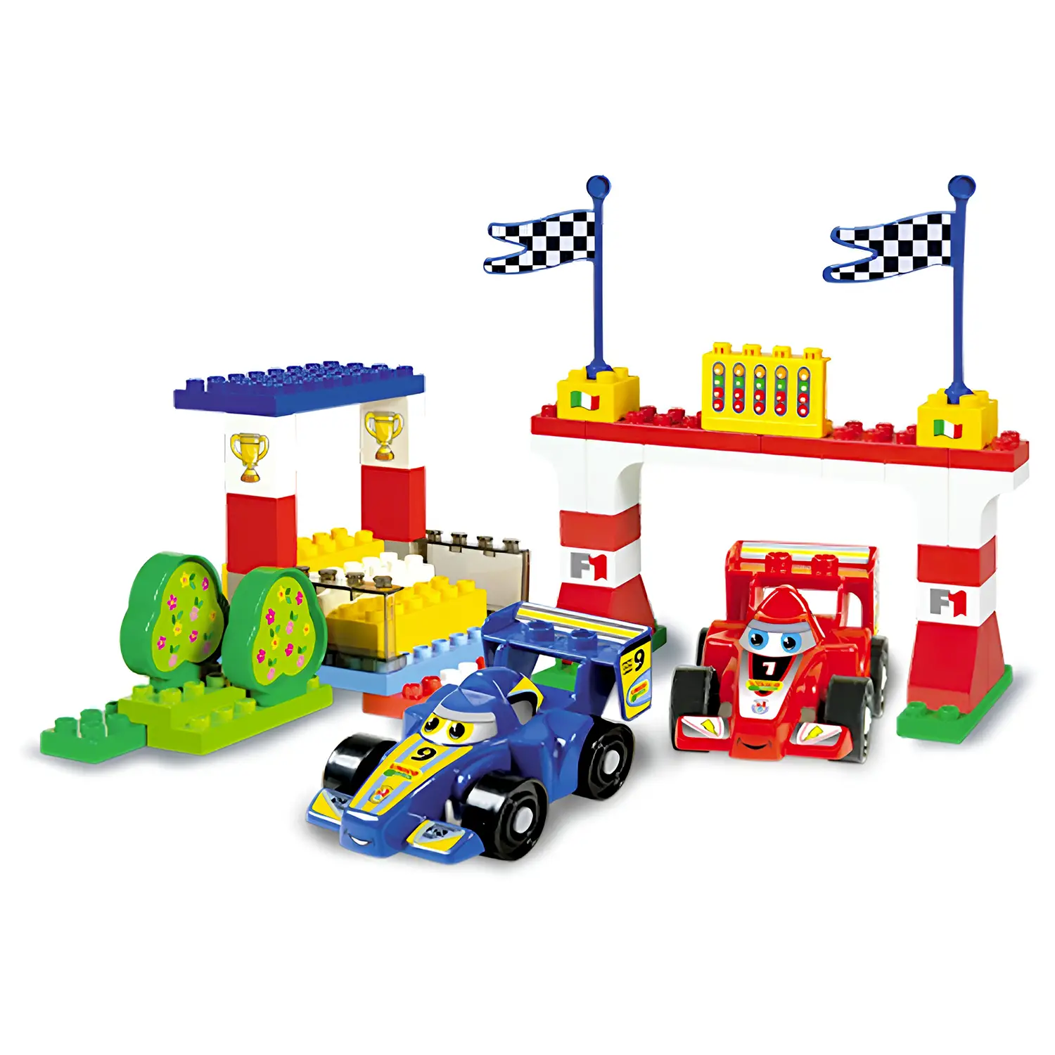 Contenuto Ricco e Divertente La confezione include 61 pezzi, tra cui 2 macchinine F1, mattoncini decorativi e accessori, ideali per ricreare gare emozionanti e scenari dinamici.
