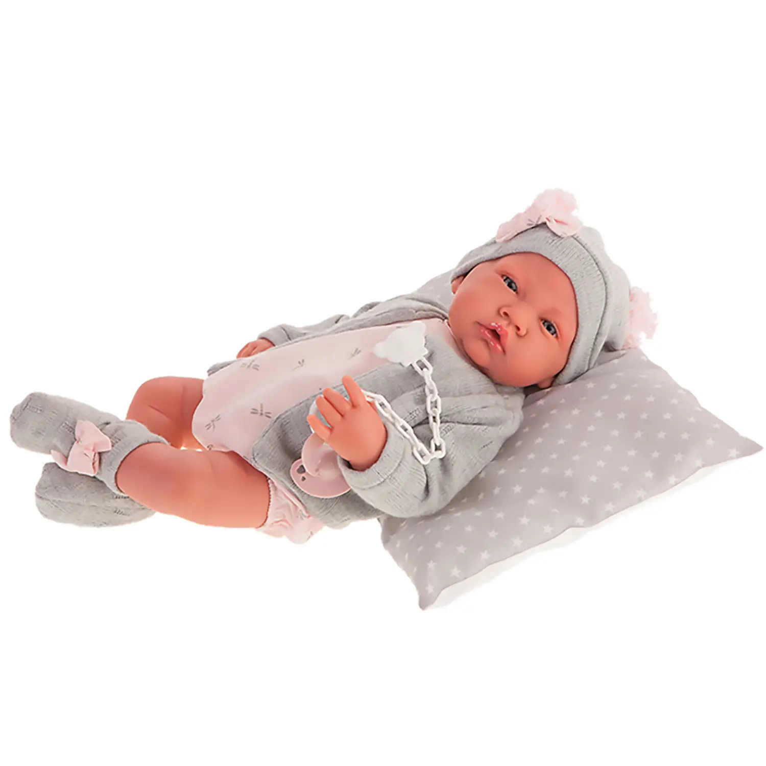 Aggiungi al gioco dei più piccoli una compagna dolce, realistica e curata nei dettagli con la Bambola Appena Nata con Cuscino e Giacca. Con il suo cappellino grigio, la tutina rosa e il golfino caldo, questa bambola Antonio Juan conquista al primo sguardo grazie al suo aspetto autentico e al look irresistibile.