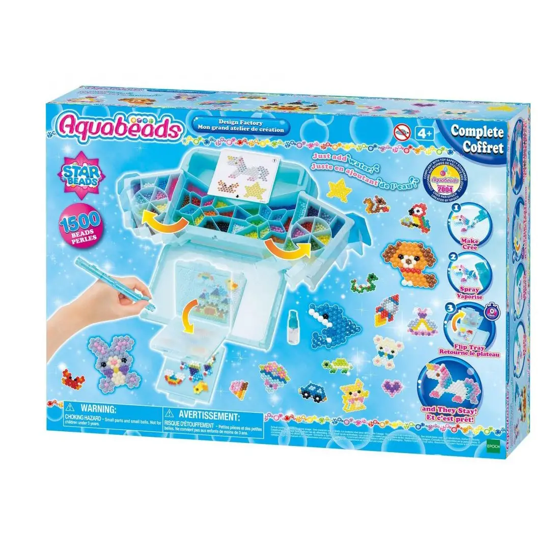 Inspire creativity with Aquabeads Design Factory, the original "stick with water" beaded craft activity game. Design Factory set includes over 1,500 star, solid and jewel beads in 48 colors, toolbox with flip-up tray, double-sided Aquabeads pen, layout tray, sprayer, pattern sheet with instructions.