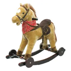 Beige Rocking Horse with Wheels, Rideable Plush, Nitrises and Moves Mouth