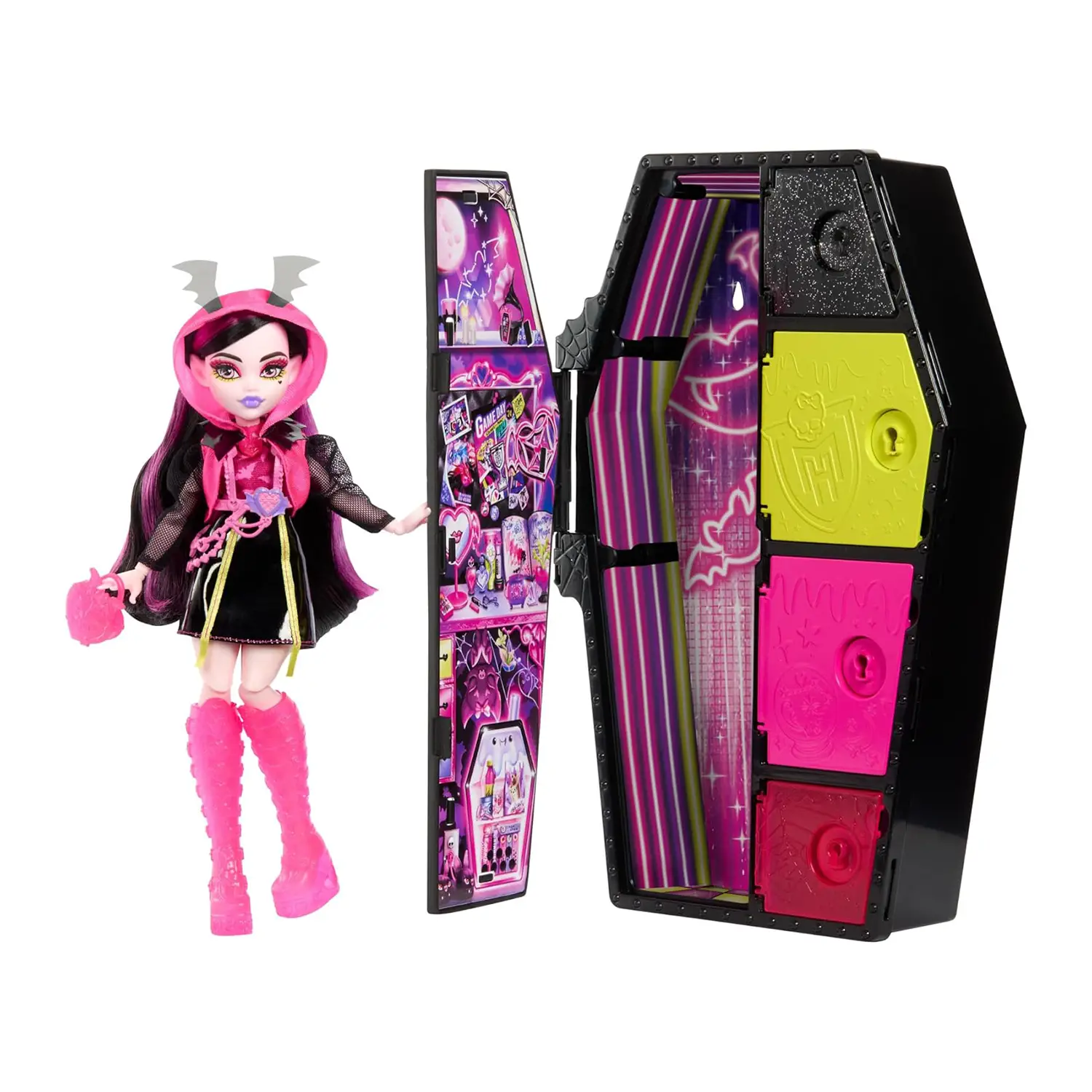 Chilling Secrets Shine in the Dark: The Monster High line Chilling Secrets is back, lighting up the dark with the new Neon Frights edition. Discover Draculaura's secret locker, filled with stylish surprises and accessories that glow in the dark.