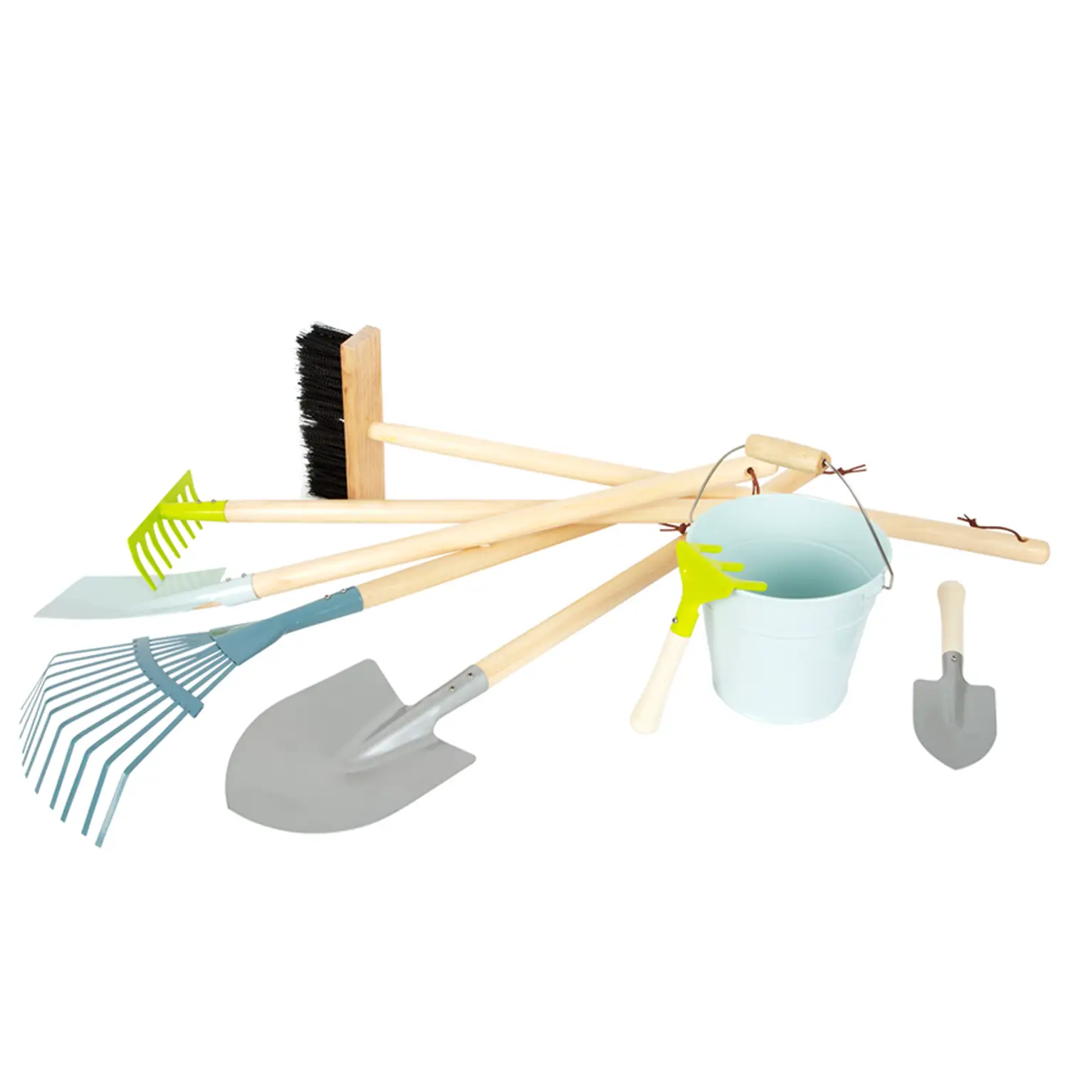- ✅ Include: vanga, pala, rastrello, scopa (80 cm), 2 piccoli utensili e secchio (h 14 cm).
