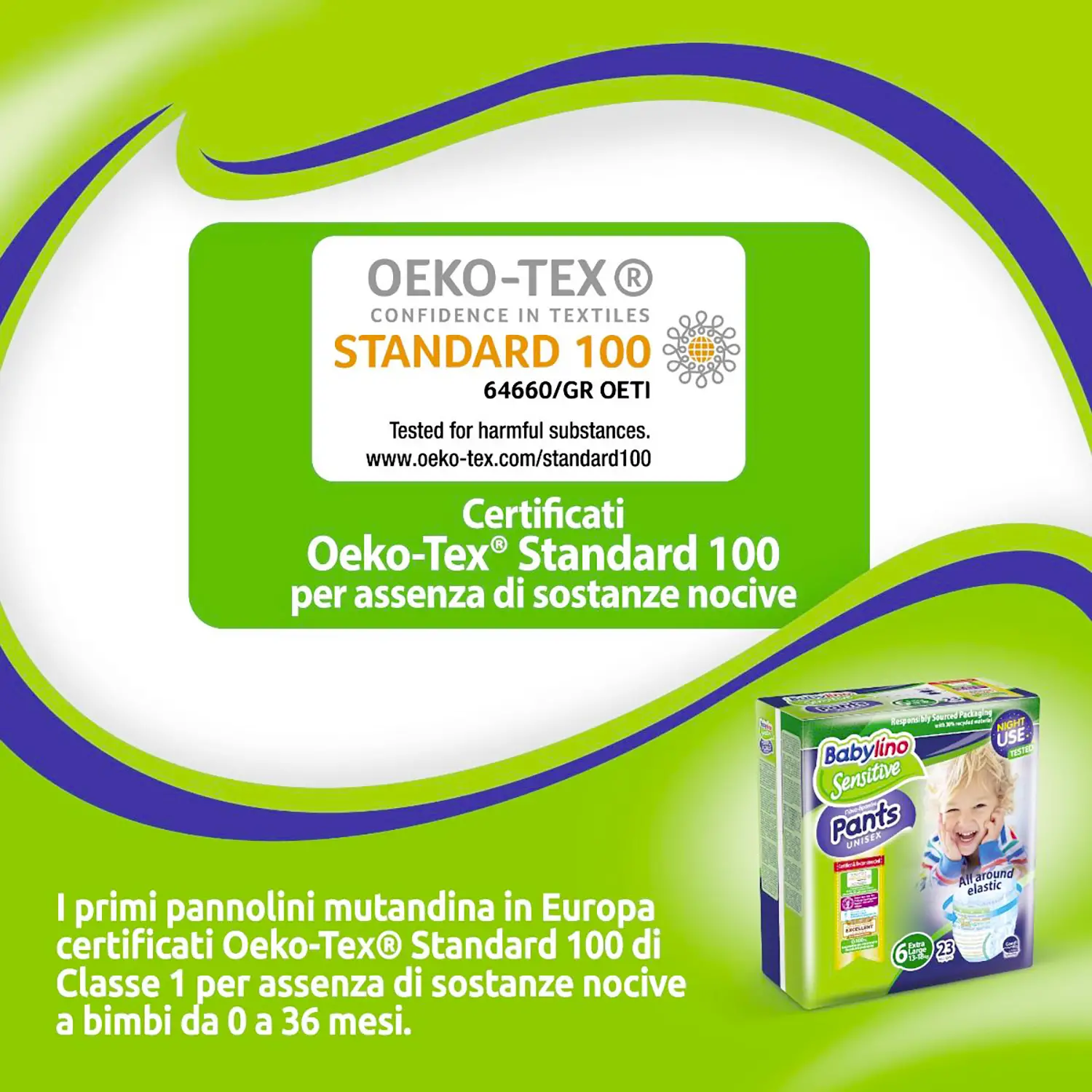 Massima Sicurezza e Certificazione OEKO-TEX I pannolini Babylino **Mutandina Taglia 6 ** sono certificati OEKO-TEX Standard 100 Classe 1, garantendo l’assenza di sostanze nocive per la pelle delicata dei bambini da 0 a 36 mesi.