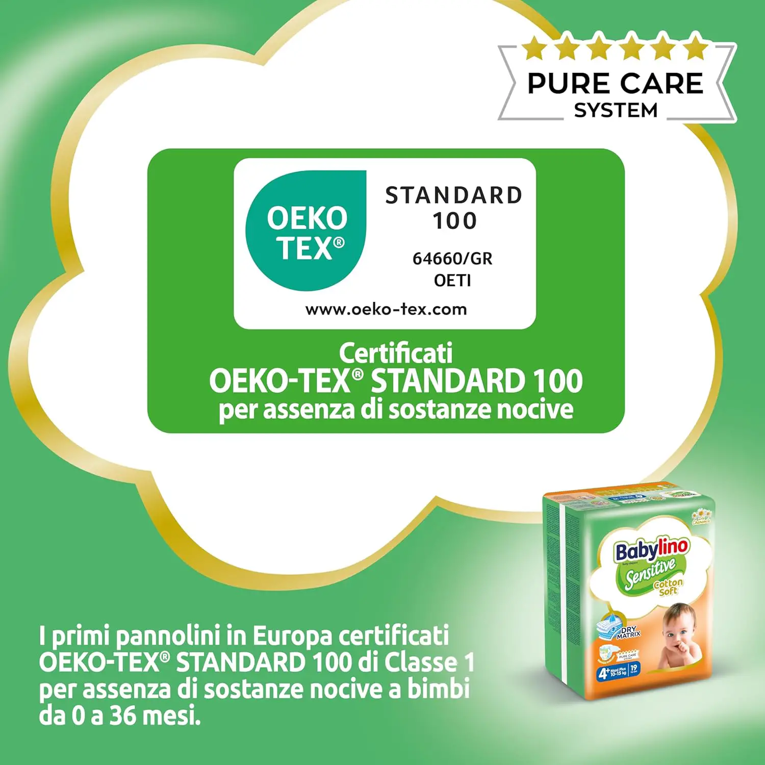 Certified Safety for Baby's Skin The first diapers in Europe certified OEKO-TEX Standard 100 Class 1, free of harmful substances for the delicate skin of babies from 0 to 36 months, for safe and dermatologically tested hygiene.