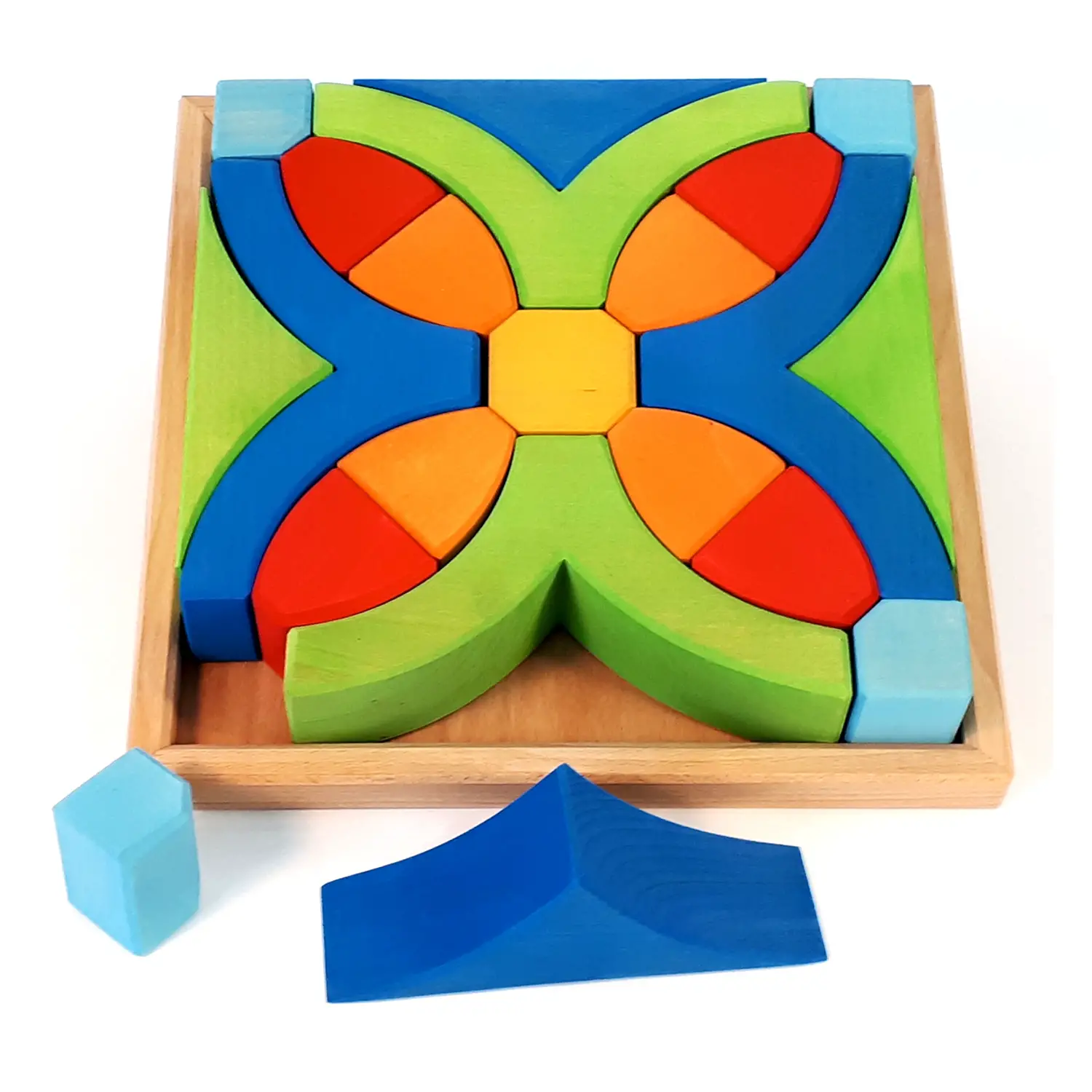 Questo set di costruzioni in legno, con sagome originali di varia forma e dimensione, è progettato per ispirare i bambini a creare costruzioni e incastri creativi. Realizzati in legno di altissima qualità, i blocchi sono finemente levigati e colorati in vivaci tonalità, stimolando la manipolazione e la creatività.