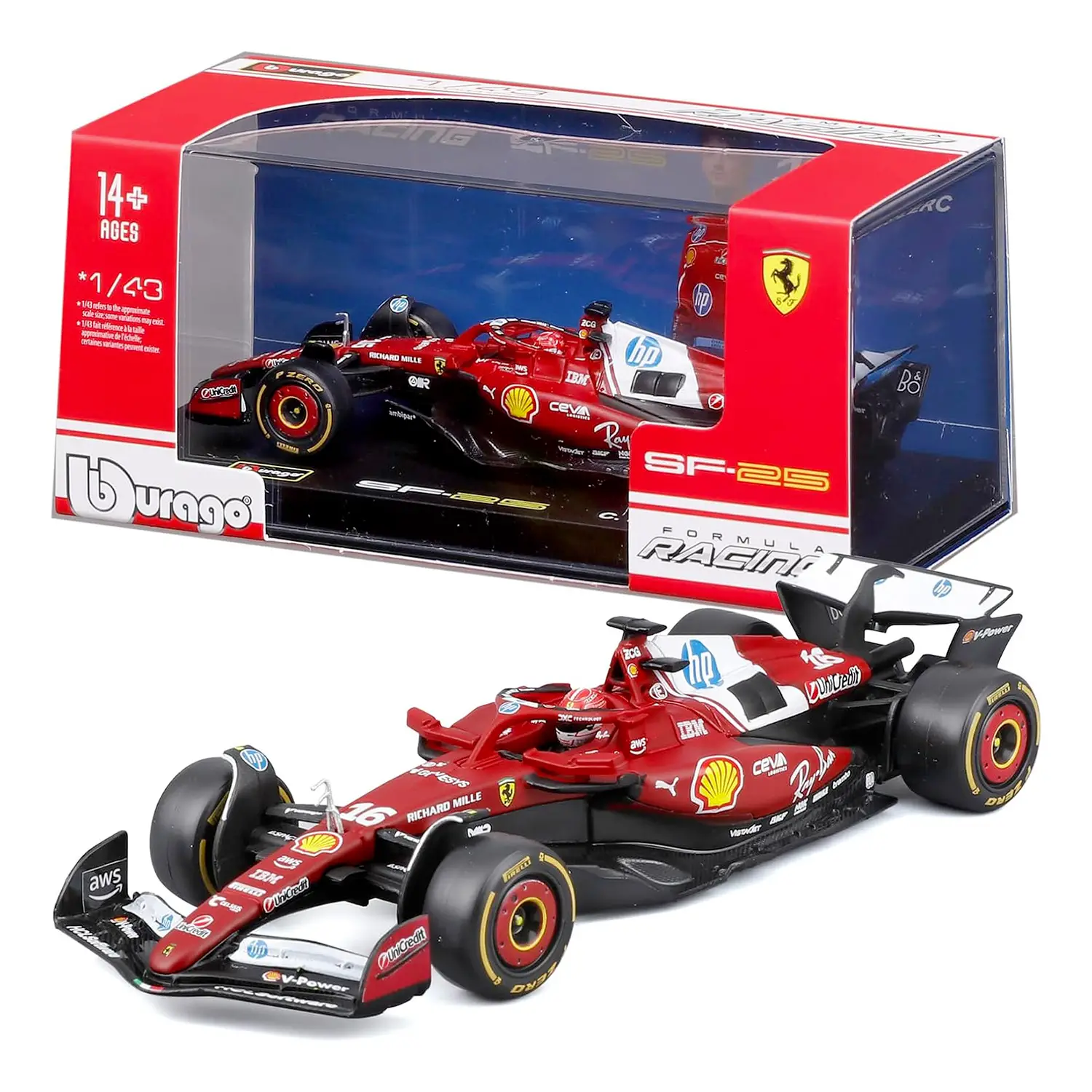 Replica ufficiale Ferrari F1 2025 – Modellino diecast in scala 1:43 della Ferrari SF-25 #16 guidata da Charles Leclerc nella stagione 2025, con licenza ufficiale Ferrari e dettagli autentici.