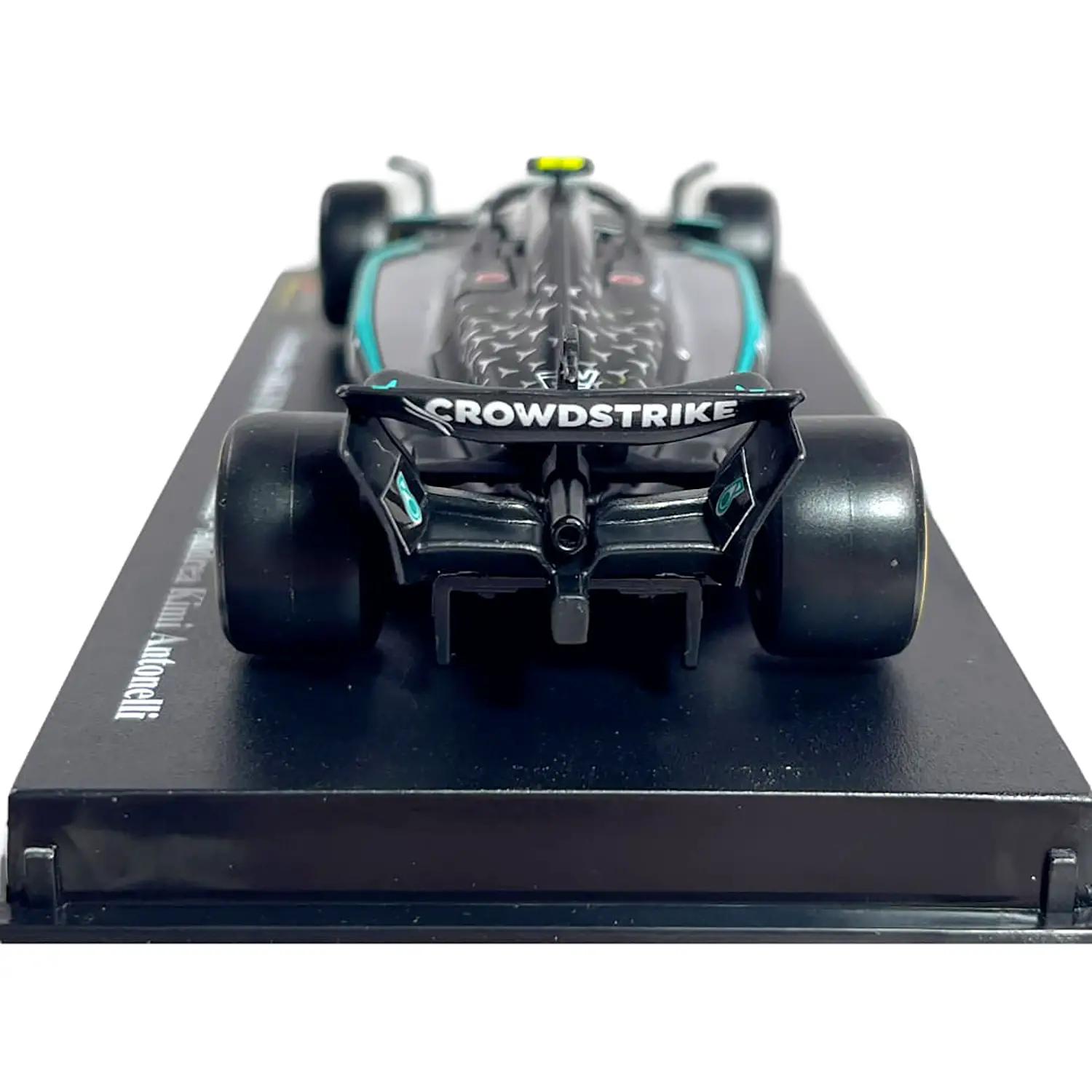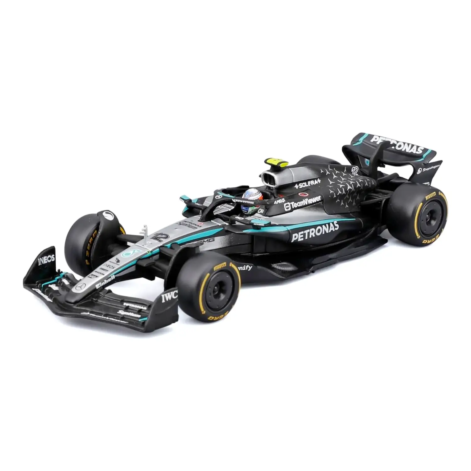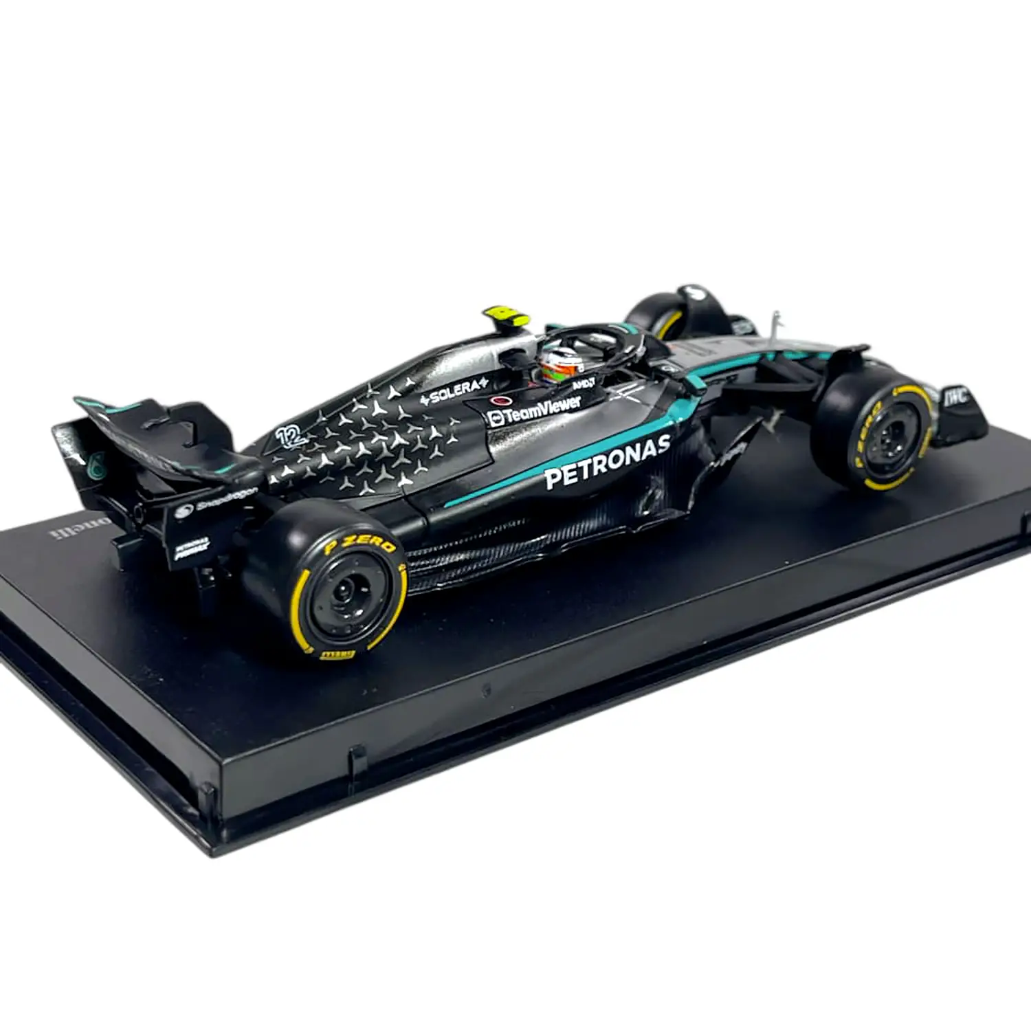 Dettagli fedeli alla monoposto reale – Livrea Mercedes-AMG Petronas 2025, sponsor ufficiali, gomme slick e aerodinamica accuratamente ricostruita per un modello da esposizione di grande impatto.