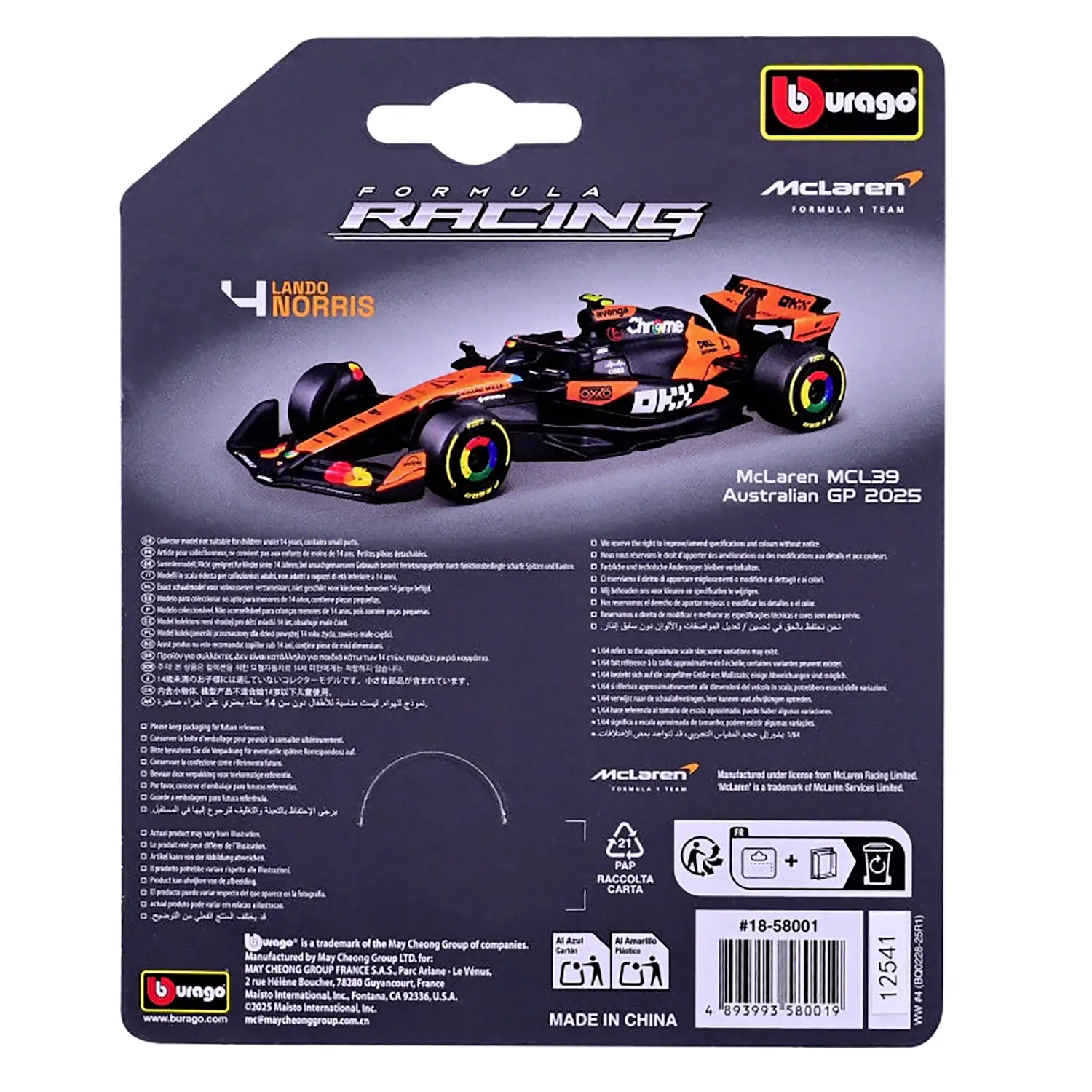 Design aggressivo e livrea McLaren Linee aerodinamiche moderne, colorazione papaya e dettagli realistici valorizzano il carattere sportivo della MCL39. Un modello che celebra lo stile McLaren e il talento di Norris nella Formula 1 2025.