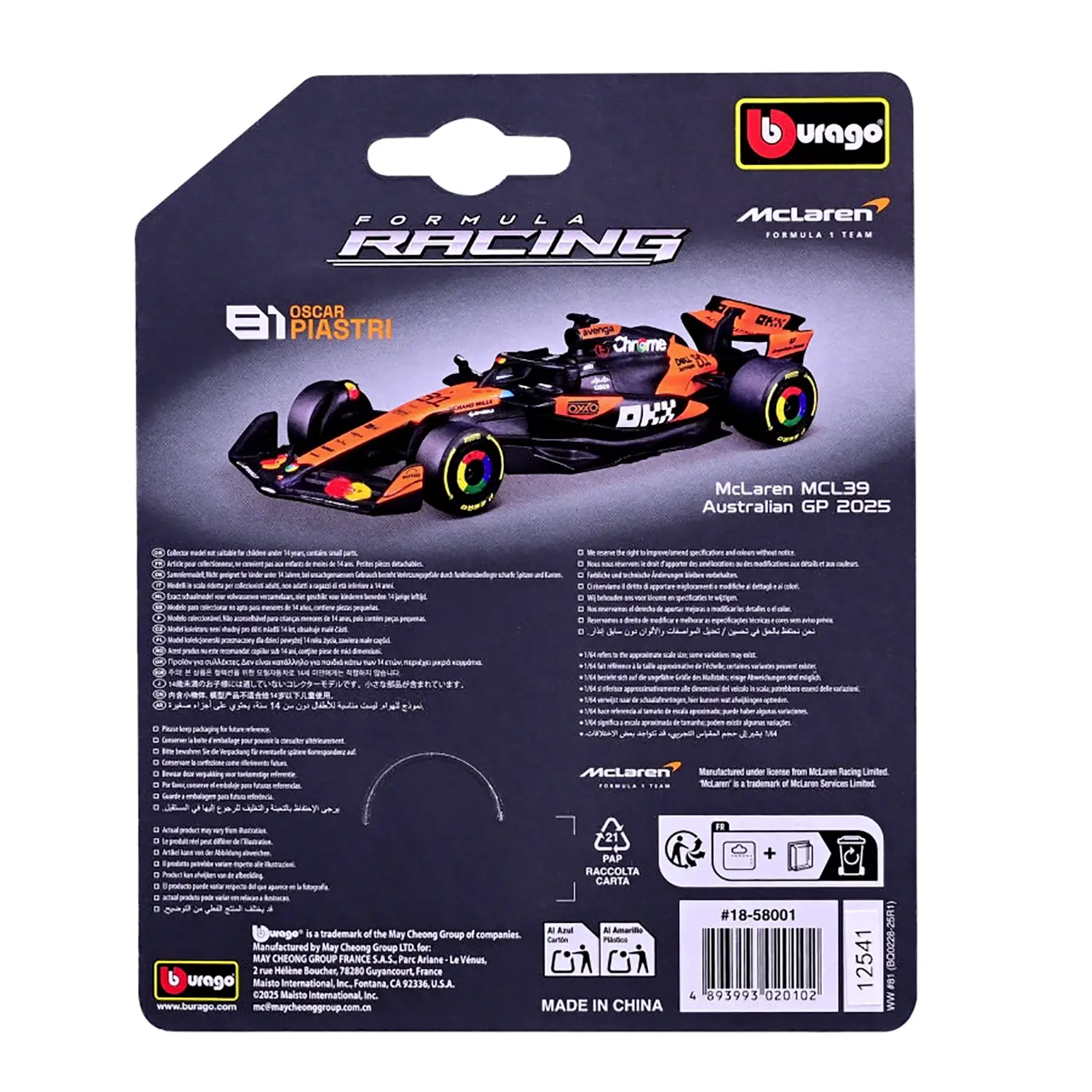 Qualità Bburago con confezione blister Prodotto ufficiale Bburago con licenza McLaren, sinonimo di affidabilità e precisione costruttiva. Confezione blister ideale per esposizione e perfetta come regalo per fan McLaren.