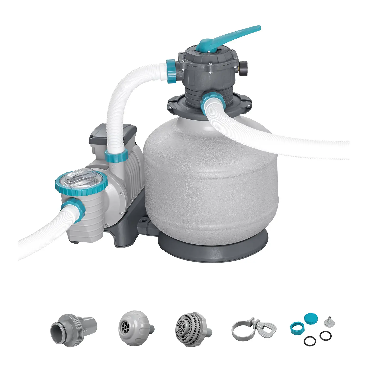 Contenuto della Confezione: - 1 pompa filtro a sabbia da 11.355 L/h - Valvola di controllo a 6 posizioni - Prefiltro e pressometro inclusi
