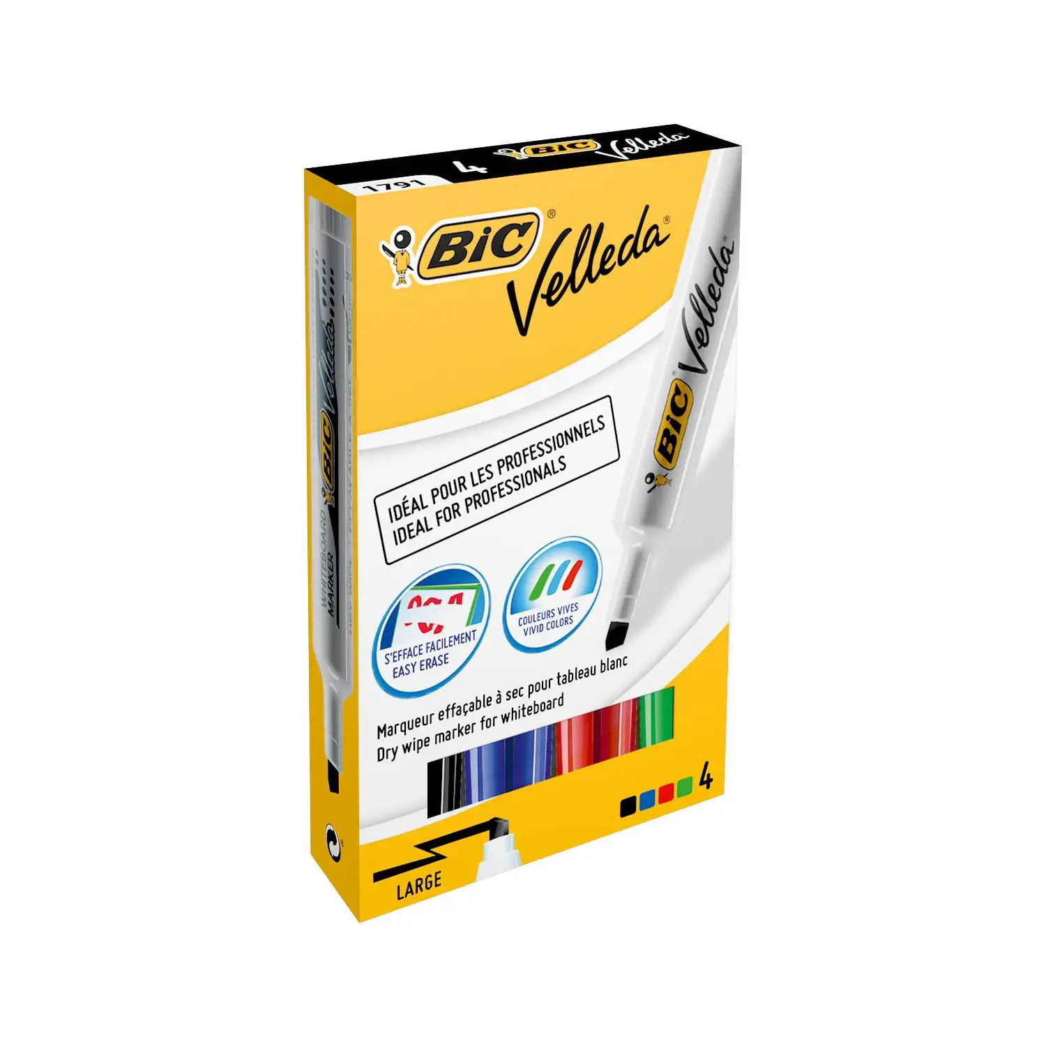Questi 4 marcatori cancellabili a secco Velleda 1791 sono disponibili in 4 brillanti colori: nero, blu, rosso e verde.