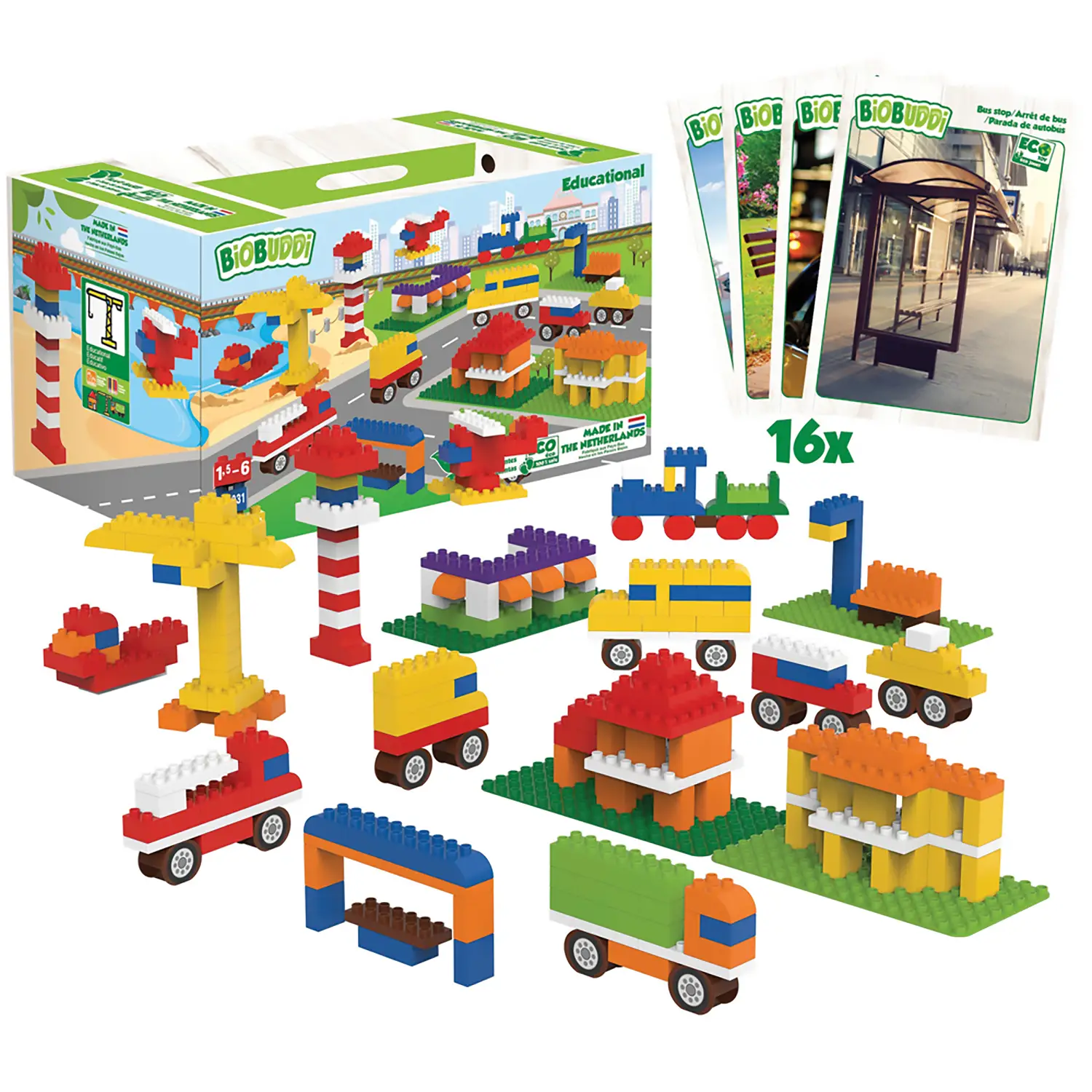 Collection of multifaceted bricks, wheels and bases to replicate realistic cityscapes and vehicles with the help of the included photo cards.