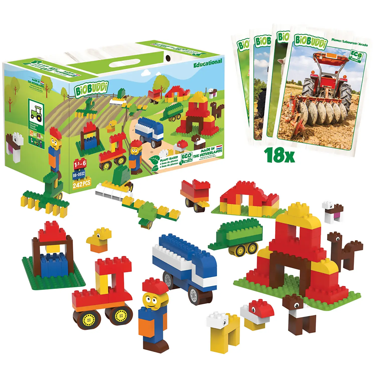 Collection of multi-shaped bricks, wheels, bases and decorated elements to reproduce realistic landscapes , characters and animals with the help of the included photo cards.