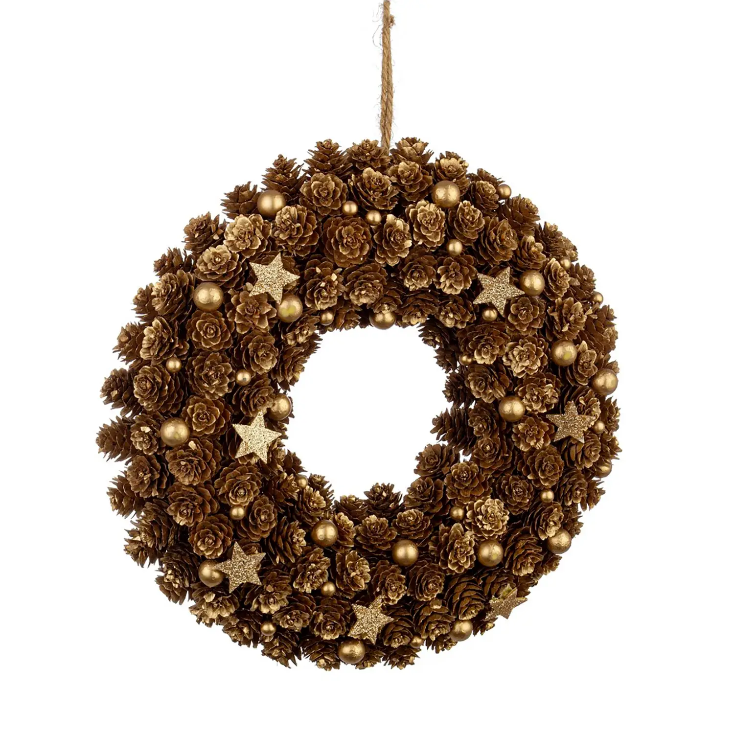 Materiali naturali e dettagli curati – Realizzata con pigne decorative arricchite da sfere dorate e stelle glitter, garantisce un aspetto ricercato e duraturo.