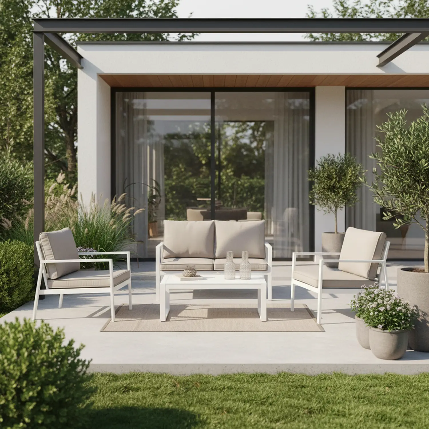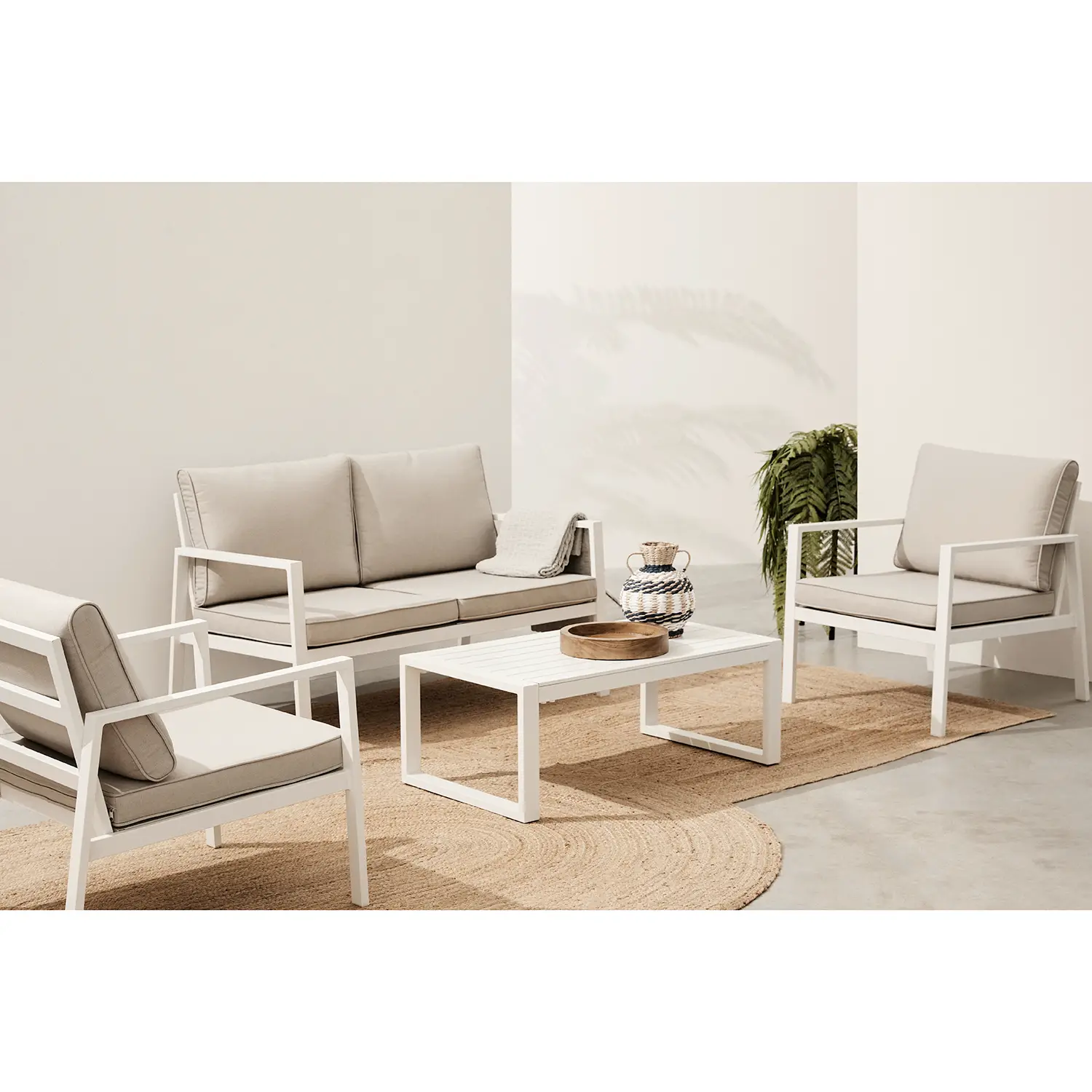 Salotto da giardino moderno 4 posti Il salotto Hilde bianco set 4 pezzi è la soluzione ideale per arredare spazi outdoor con eleganza. Perfetto per giardino, terrazzo e veranda, combina design contemporaneo e funzionalità per creare un’area relax accogliente.