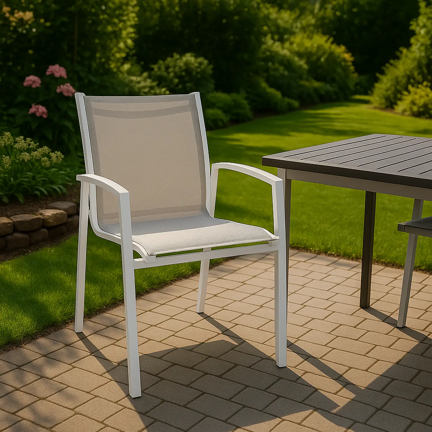 Elegante e funzionale, la Sedia Hilla Bianco Cloud con braccioli di Bizzotto unisce comfort, resistenza e design moderno. Ideale per arredare giardini, terrazze e patio, questa sedia impilabile offre praticità senza rinunciare allo stile.