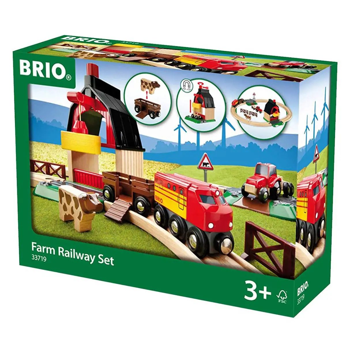 Scopri la vita di campagna con il set Brio World Ferrovia della Fattoria 33719, un fantastico kit ferroviario ispirato al mondo rurale. Include una locomotiva con vagone, un trattore, una mucca, un carico di fieno e un fienile con gru magnetica funzionante per trasportare il fieno nel granaio.