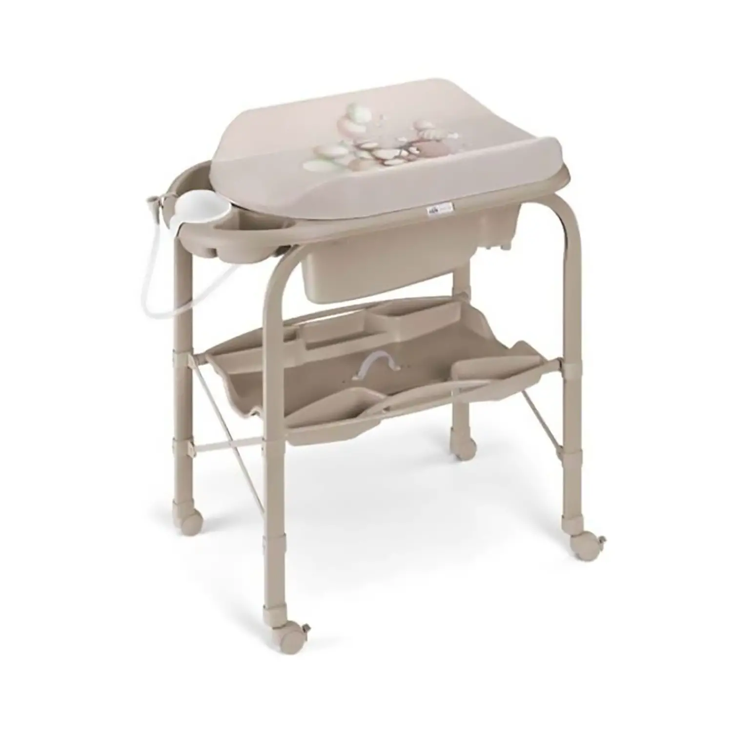 Bagnetto Cambio,Con morbido fasciatoio dotato di sistema di anti-ribaltamento, include vaschetta Baby Bagno con 2 sedute anatomiche e antiscivolo (una inclinata per bimbi da 0 a 6 mesi e una seduta con braccioli per bimbi da 6 a 12 mesi), vani portasapone e porta spugnetta, doccino, tappo e tubo per scarico dell’acqua, cassetto portaoggetti con porta flaconi, 4 ruote di cui 2 con freno. Ideale per i bagni più piccoli, può essere posizionato sui sanitari. Pratico e innovativo sistema di chiusura ultra compatto.