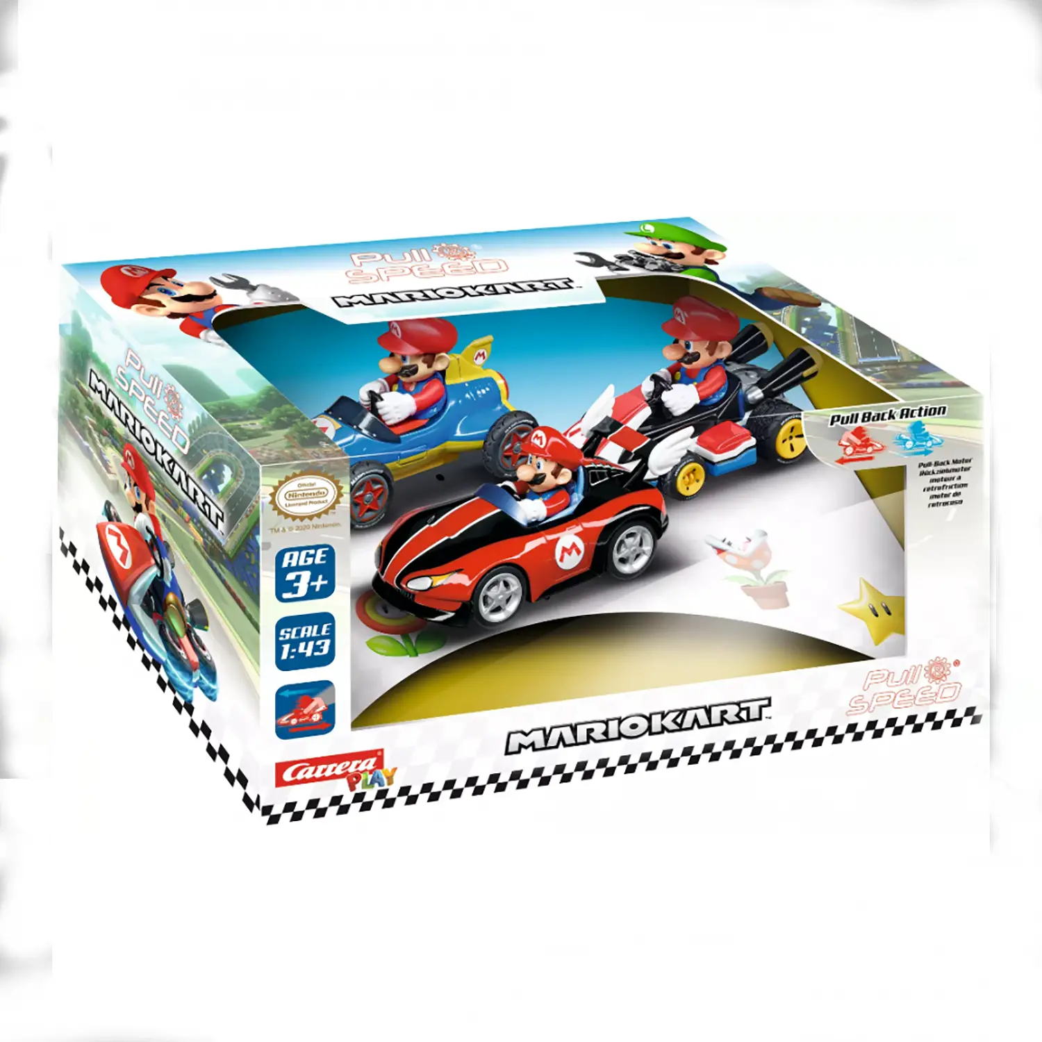 - ✅ Set Mario Kart da 3 modellini Pull & Speed con Mario in versioni diverse: Wii, Kart 8 e Mach 8.