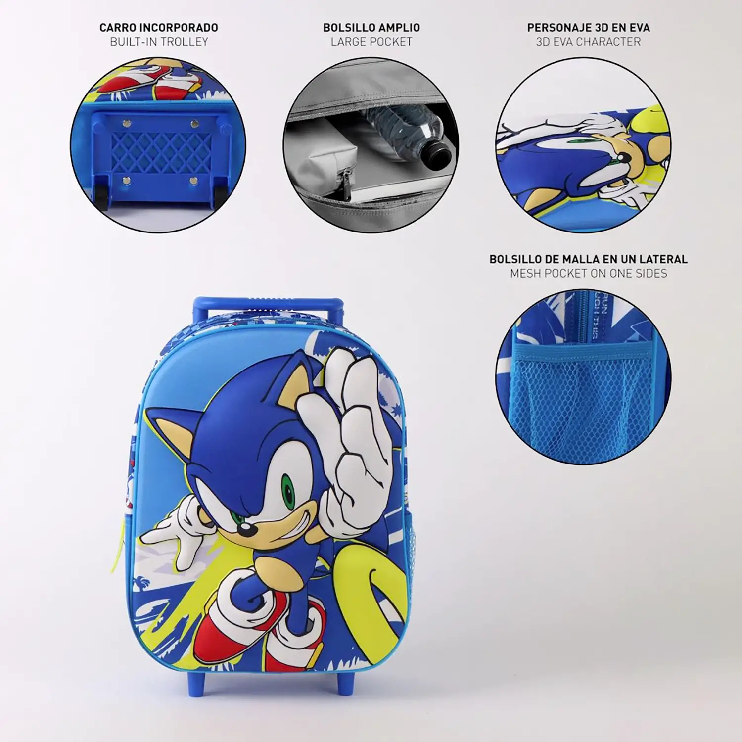 Zaino Trolley Sonic 3D per Bambini Lo zaino trolley Sonic 3D è perfetto per accompagnare i bambini a scuola o all’asilo. Con grafica tridimensionale del celebre personaggio, unisce funzionalità e stile per un utilizzo quotidiano pratico e divertente.