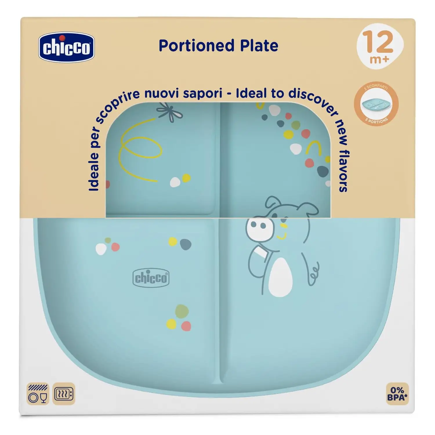 Chicco's Meal Plate with Compartments is designed for children 12 months and older, helping them explore new tastes and encourage independence during mealtimes.