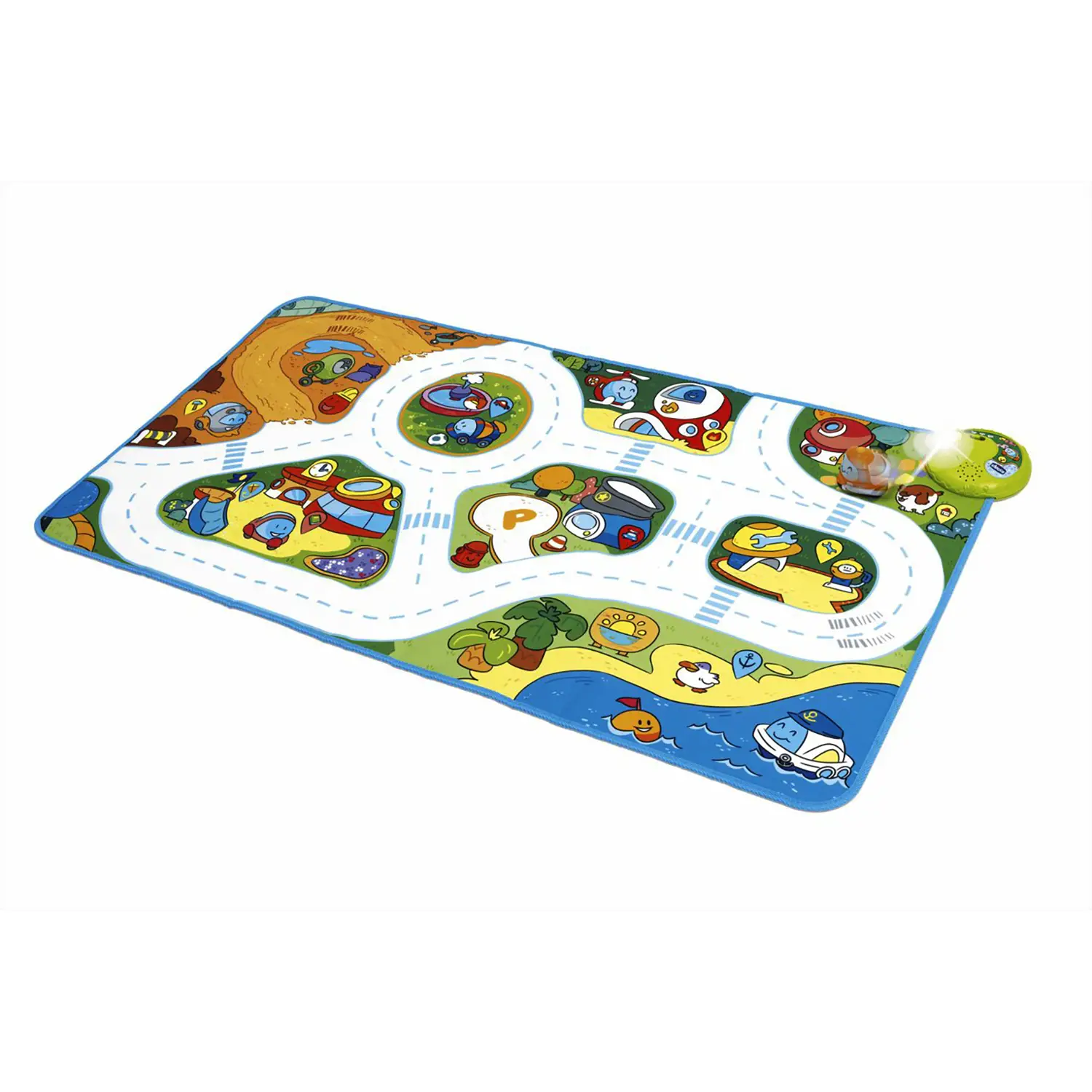 Ambiente Urbano Interattivo: Il tappeto riproduce un vivace scenario cittadino con 15 punti di attivazione. Bambini possono esplorare vari aspetti della vita urbana semplicemente premendo le icone sul tappeto o facendo passare il veicolo Turbo Ball incluso attraverso le zone di attivazione.