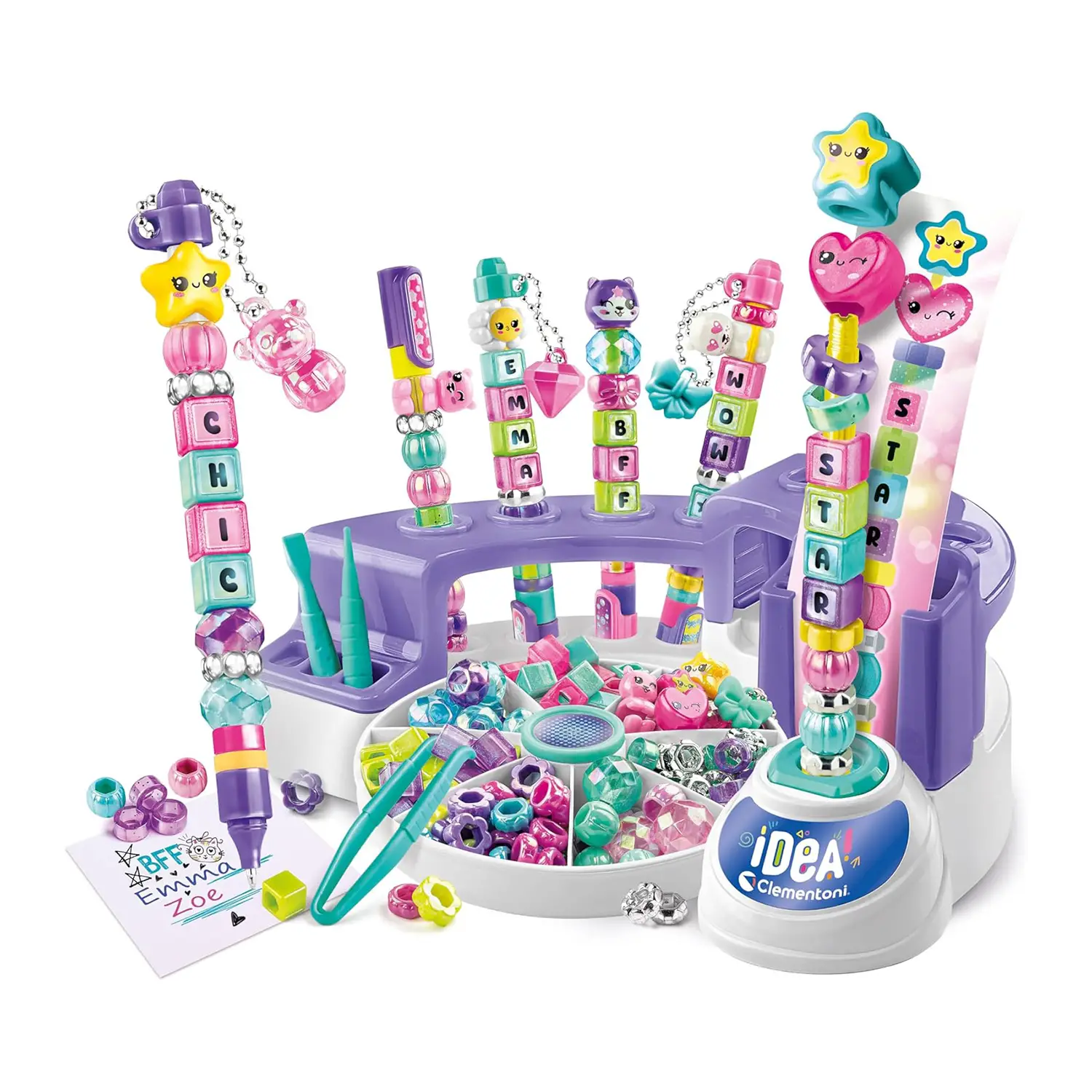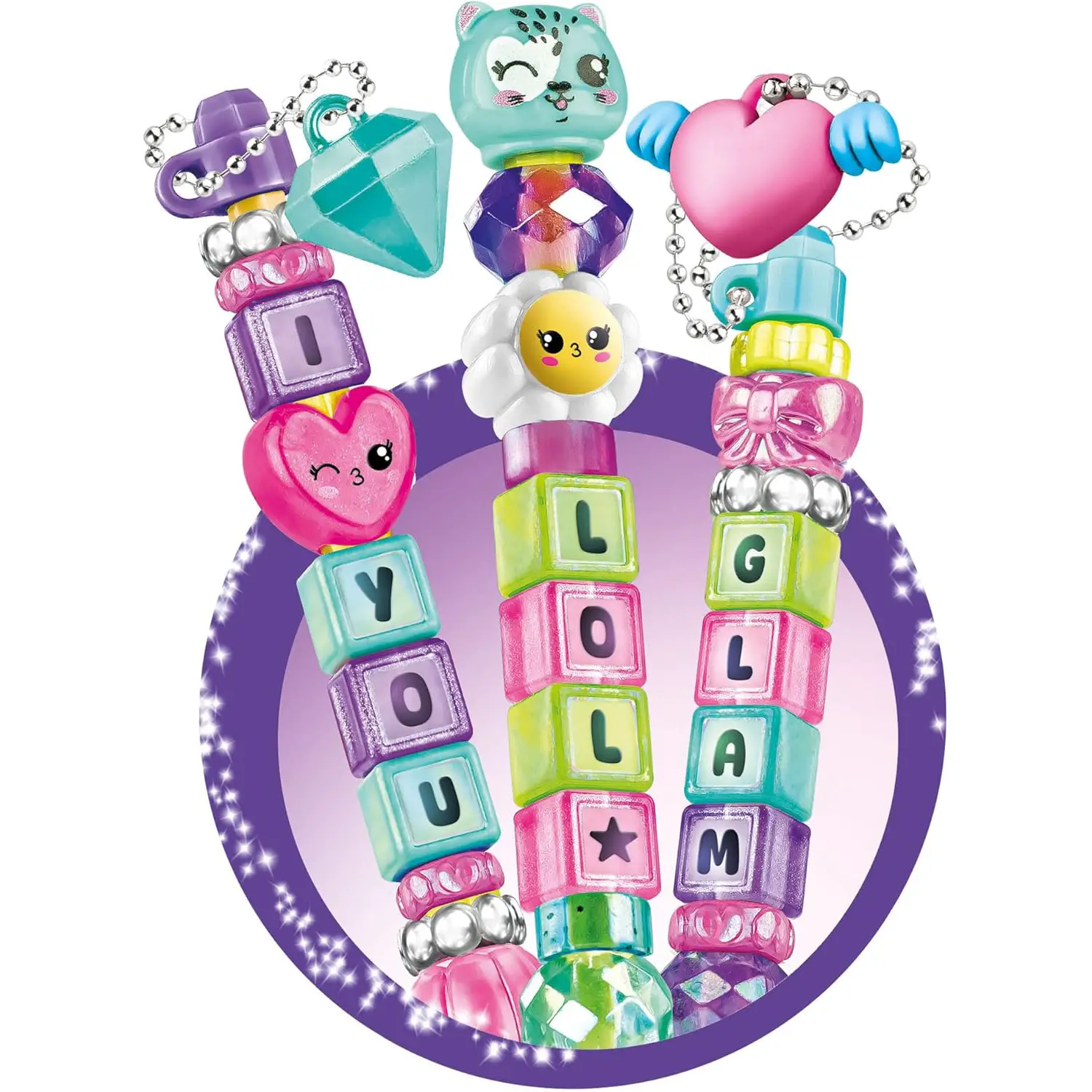Accessori inclusi per infinite combinazioni il kit contiene più di 100 elementi: lettere, charms con catenelle, perline colorate, distanziatori e adesivi. Questi dettagli permettono infinite possibilità di personalizzazione, stimolando fantasia e precisione manuale nei bambini.