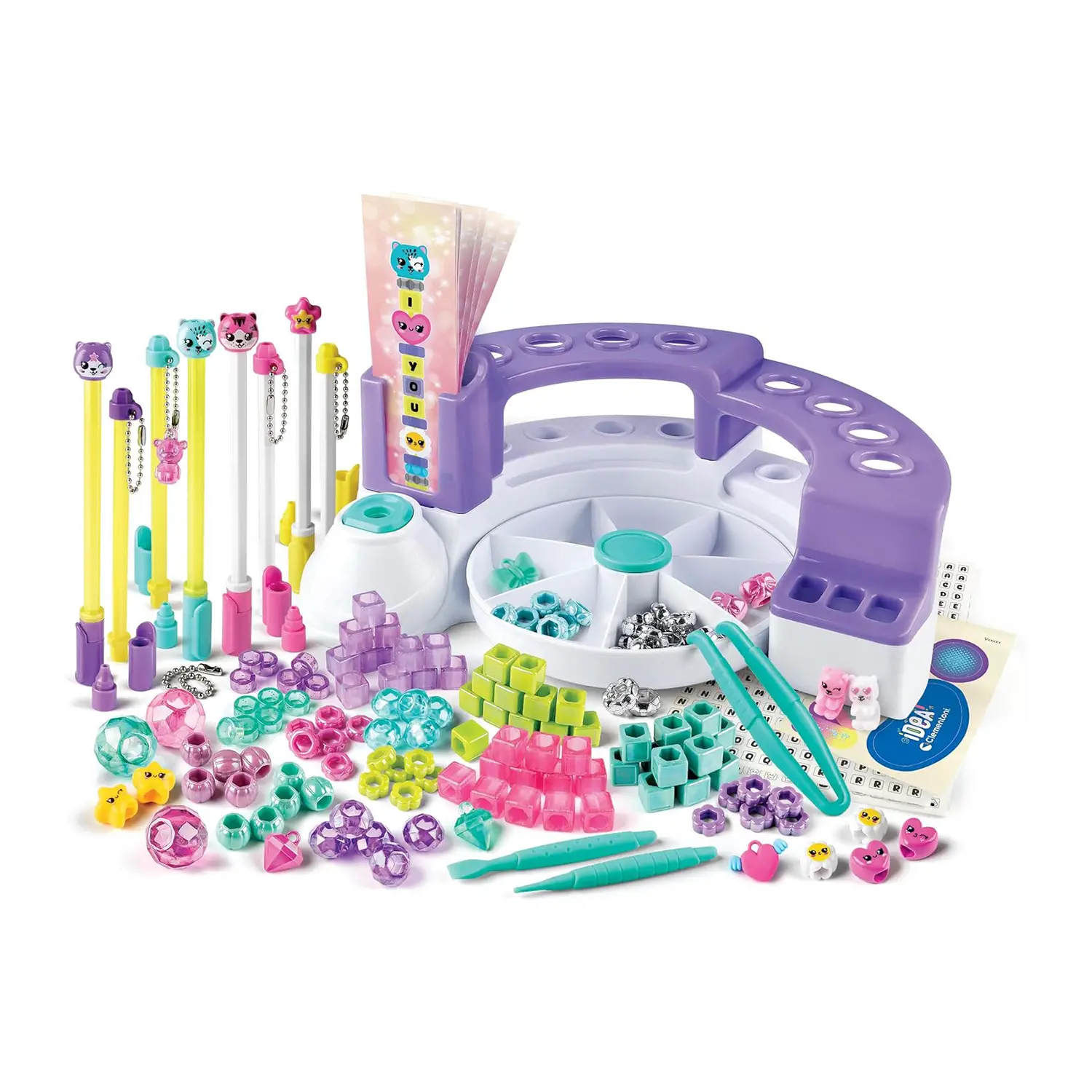 Contenuto del kit dettagliato nella confezione troverai: 8 penne componibili, 12 ricariche, base da lavoro, strumento di infilatura, pinzette, lettere, perline, charms con catenelle, adesivi decorativi, schede guida e manuale in italiano.