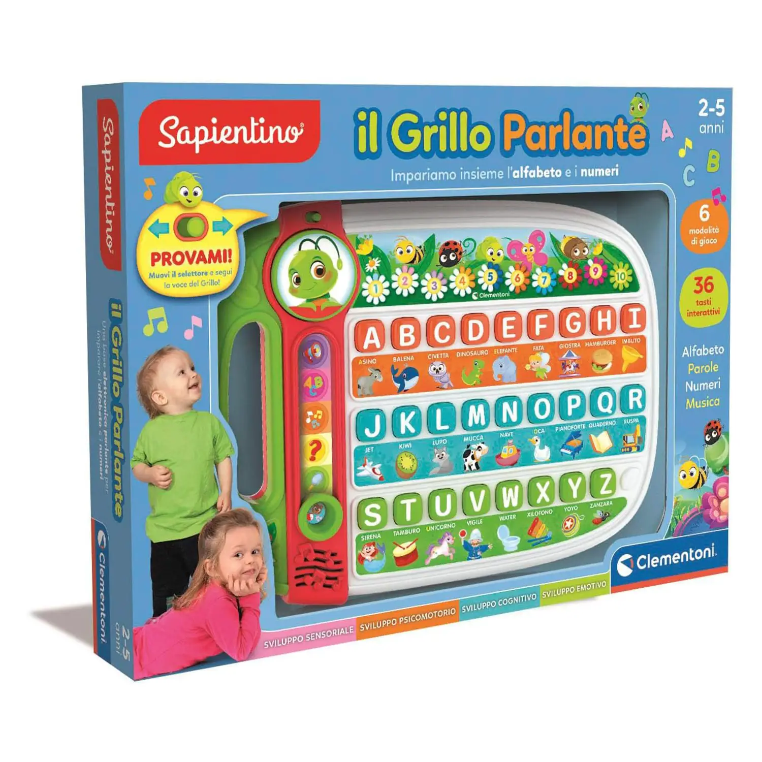 Gioco educativo interattivo – Il Grillo Parlante Clementoni aiuta i bambini a imparare lettere, numeri, parole e musica con 36 tasti e 6 modalità di gioco coinvolgenti.