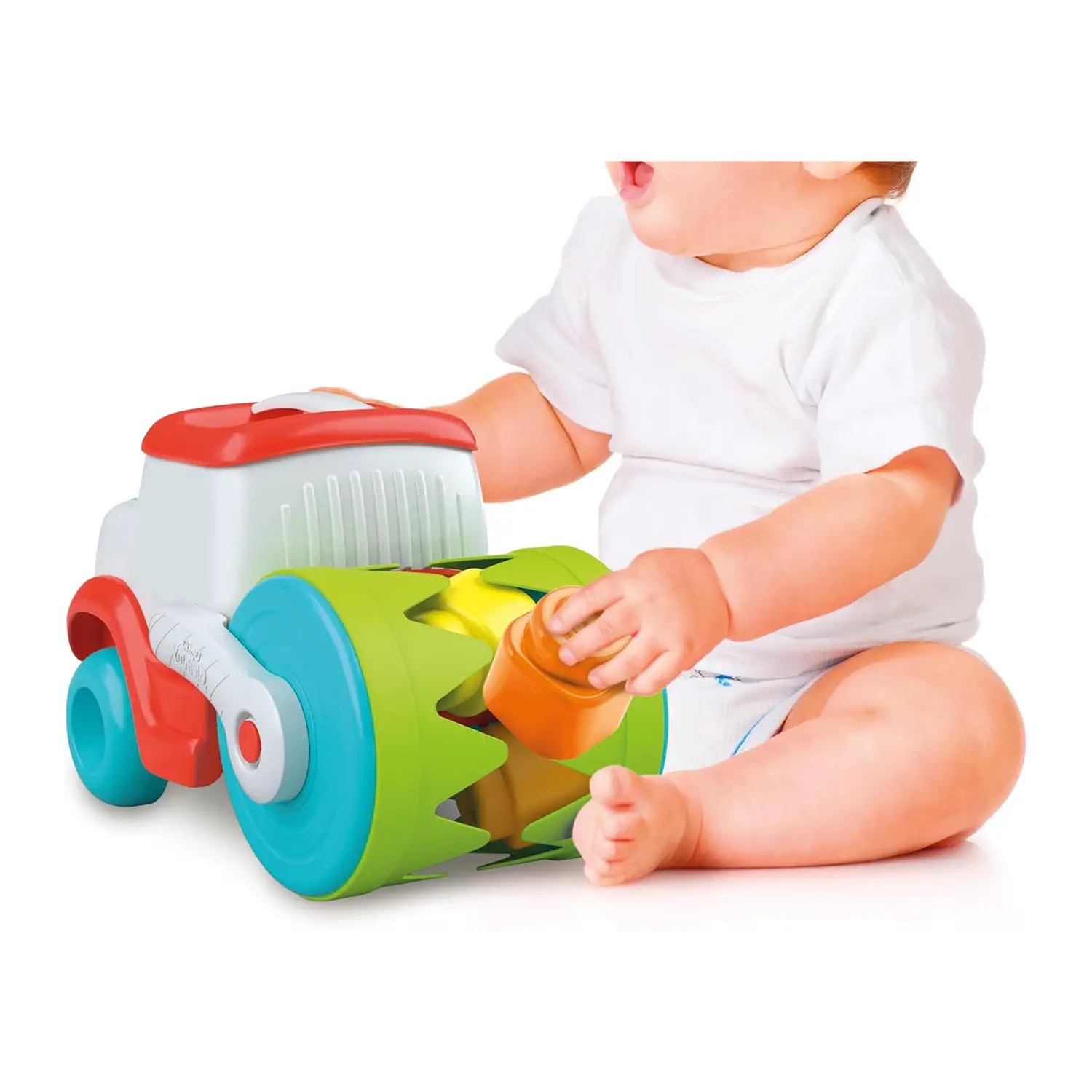 "Brick-Eating" Roller and Soft Textures The vehicle features a "bricks-eating" roller that makes play even more fun and stimulating. Soft textures and Clemmy material inserts promote tactile perception and encourage baby to explore through touch.