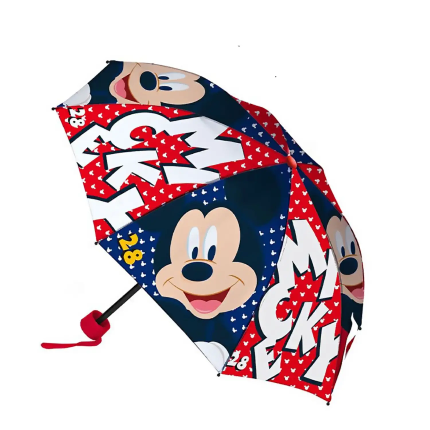 - ✅ Folding umbrella with red and blue design and Mickey Mouse image for cheerful style.