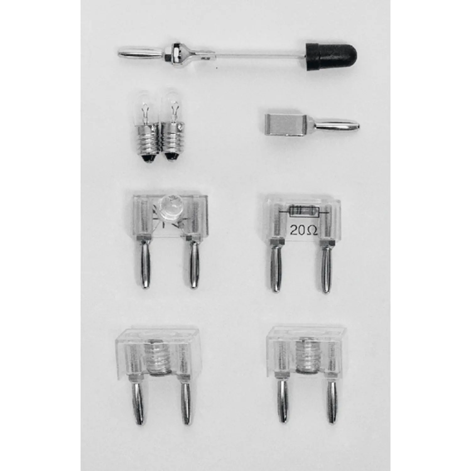 Contenuto: - 2 lampadinbe E10 / 6V / 0,3A - 2 portalampade E10 - LED con resistenza - Interuttore a leva - Resistenza da 20 Ohm