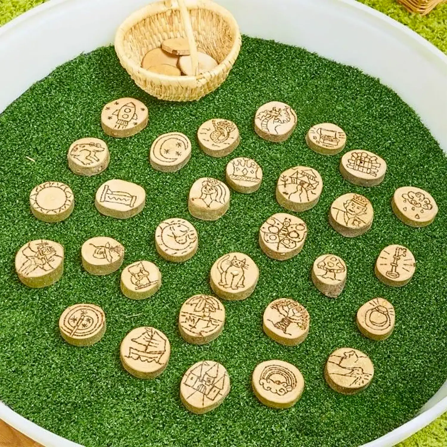 - ✅ Set di 30 dischi narrativi in legno naturale, ogni pezzo con illustrazione unica per stimolare la fantasia dei bambini.