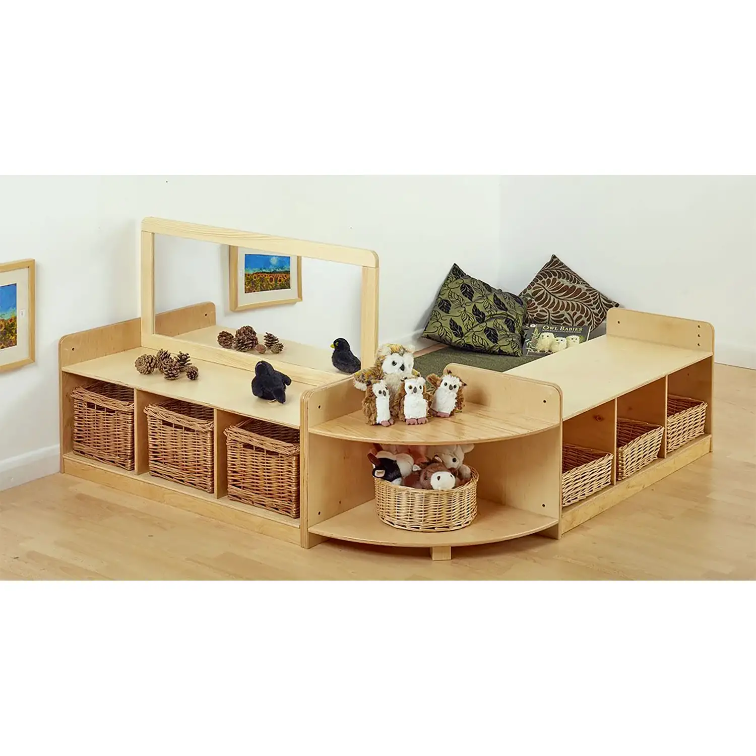 Set di Mobili Per Angolo Primi Passi – Versatile e Funzionale Un pratico set di arredi per spazi educativi, perfetto per l’organizzazione e il gioco. Include 1 modulo contenitore basso, 1 modulo angolare basso e 1 unità con specchio, progettati per stimolare la curiosità e mantenere l’ambiente ordinato.