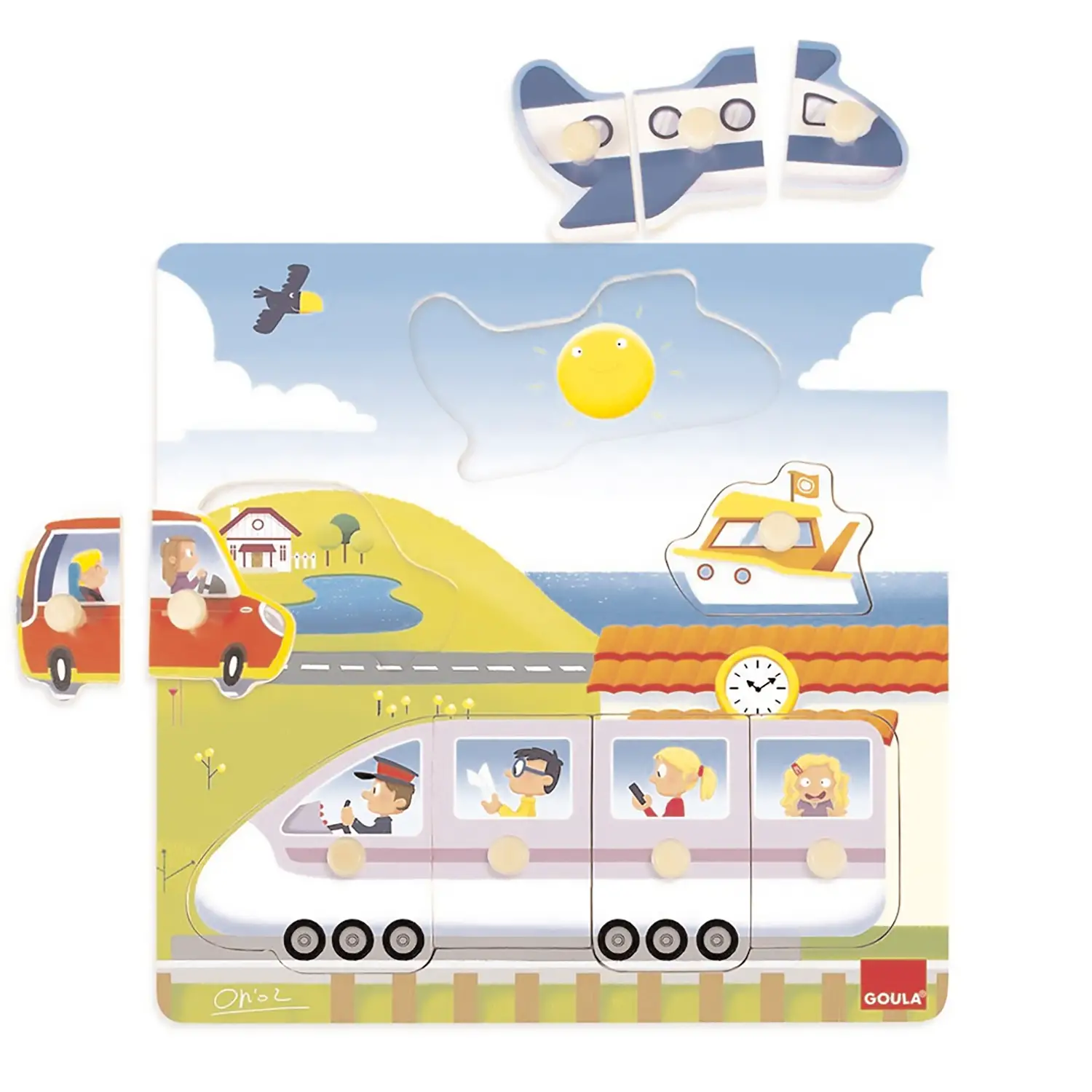 Puzzle di legno di 10 pezzi con perno piccolo. Insegna ai bambini diversi mezzi di trasporto. Illustrato all’interno