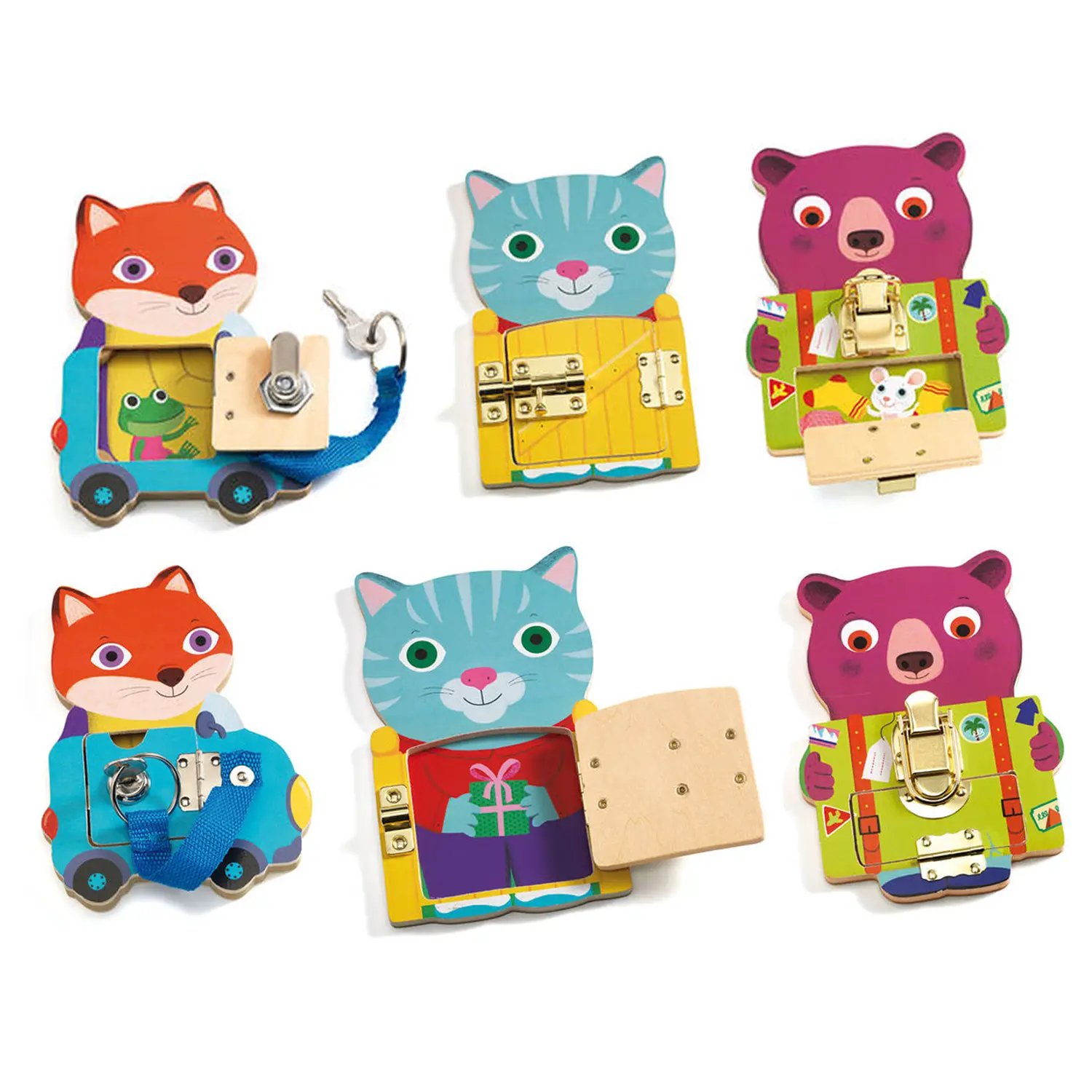 Discover the world of locks and locking mechanisms with the educational game "Lockhouse"! A fun wooden game where a cat, a fox and a teddy bear keep their treasures and little friends hidden behind a little door to open, using different types of latches: latch , hook and lock! A game that stimulates curiosity and encourages the development of fine motor skills, eye-hand coordination and logical reasoning.