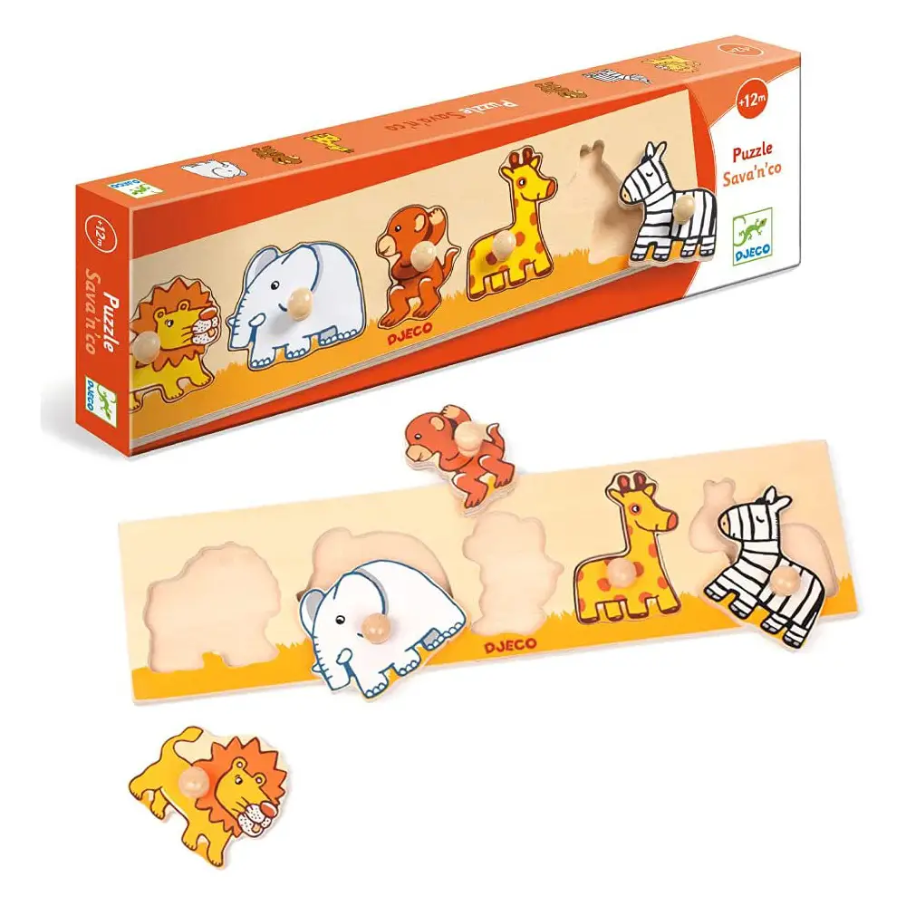 - ✅ Puzzle in legno a tema savana con leone, elefante, scimmia, giraffa e zebra.