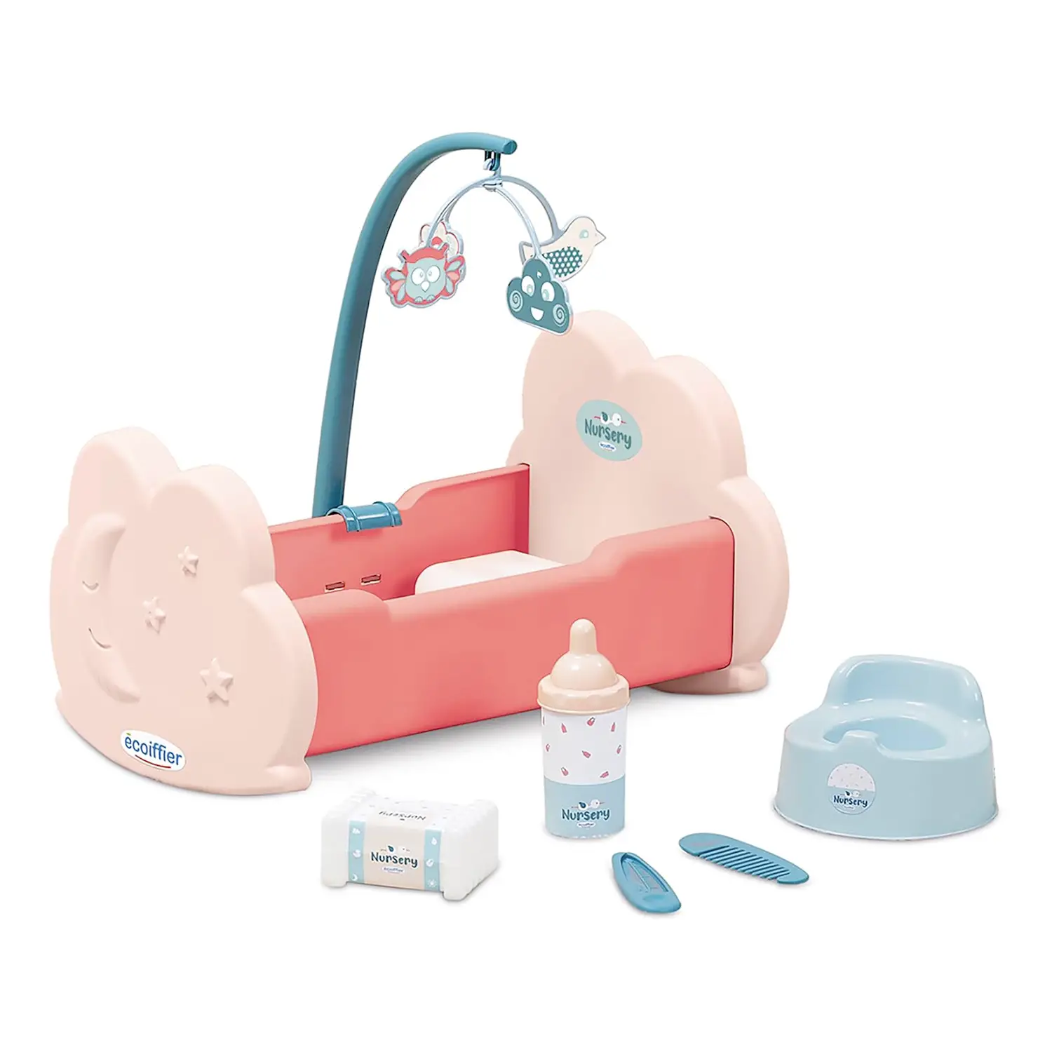 Letto per bambole completo di accessori - Set gioco composto da lettino, vasino, pannolini, biberon, termometro e pettine, perfetto per imitare la routine quotidiana.
