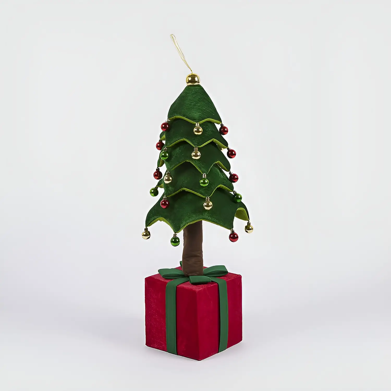 Stile unico e originale – Il Decoro Pino su Pacco da Appendere firmato Enzo De Gasperi è alto 90 cm e unisce l’eleganza del classico albero di Natale alla fantasia del pacco regalo come base.