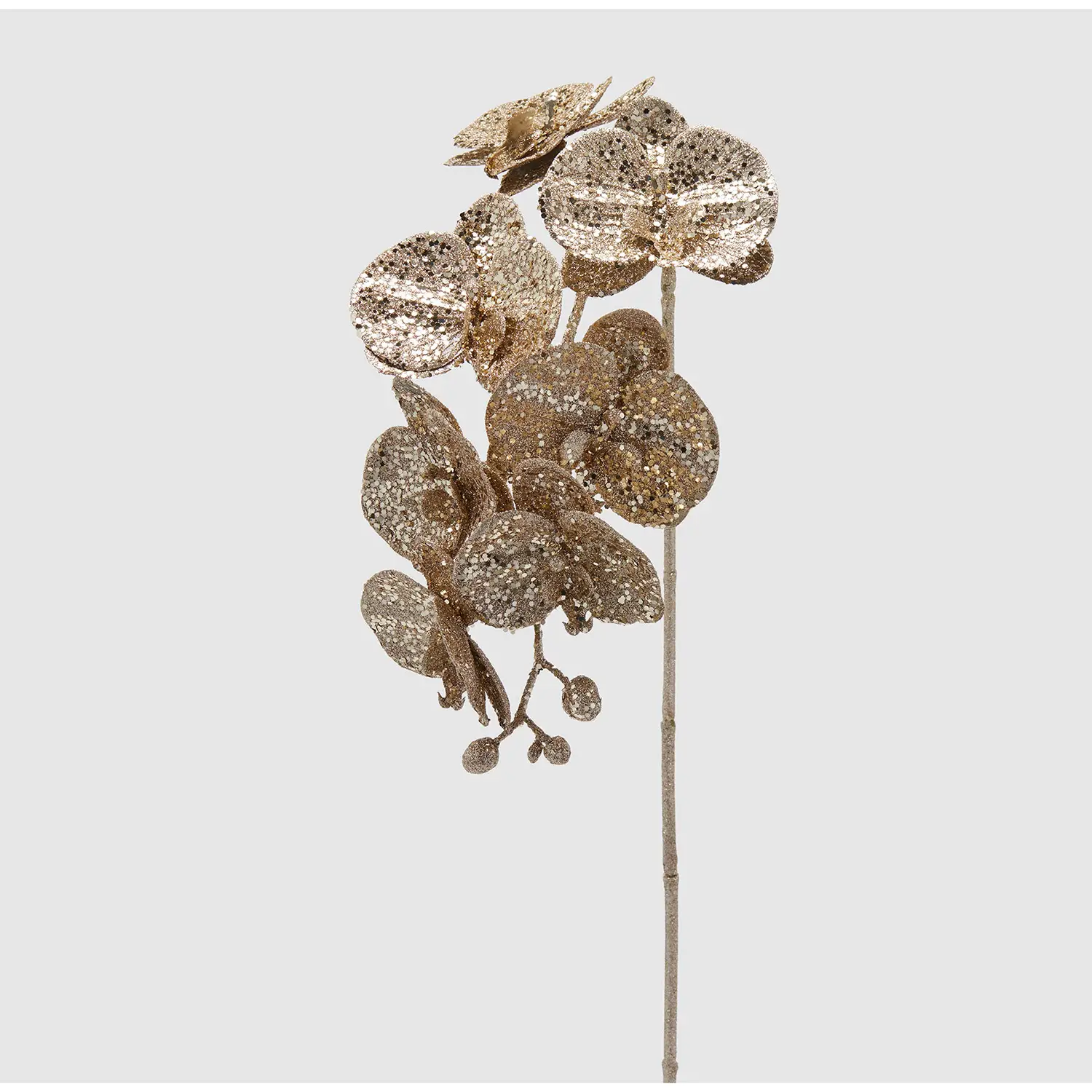 Orchidea Glitter Ramo Decoro Albero: Eleganza Brillante per le Tue Decorazioni Natalizie Aggiungi un tocco di lusso al tuo albero di Natale con il Ramo Orchidea Glitter. Questo ramo, alto 85 cm, è decorato con glitter dorati che catturano la luce, creando un effetto scintillante e festoso.
